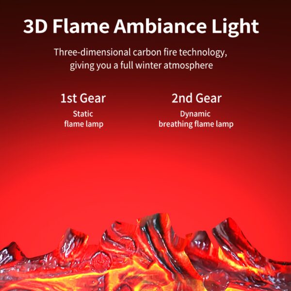 - تأثير اللهب الديناميكي ثلاثي الأبعاد: استمتع بجمال بصري آسر يحاكي لهب النار الحقيقي بفضل تقنية الـ 3D المبتكرة. تضفي هذه الميزة الفريدة جواً من الدفء والراحة والأناقة على مساحتك، دون أي مخاطر أو فوضى.
