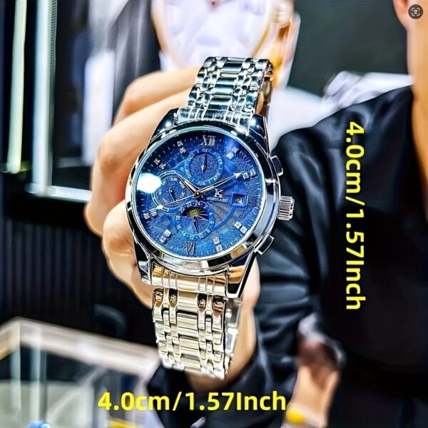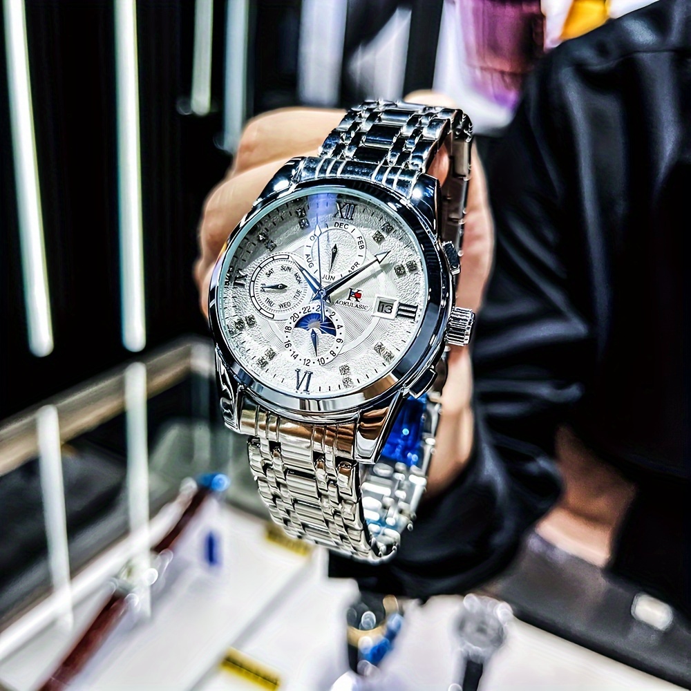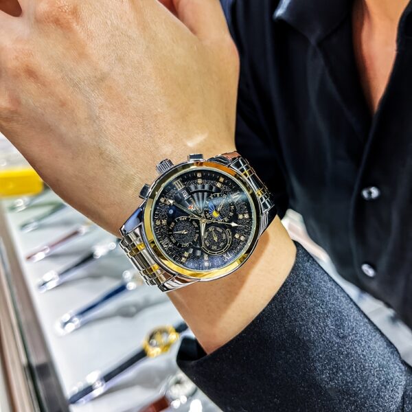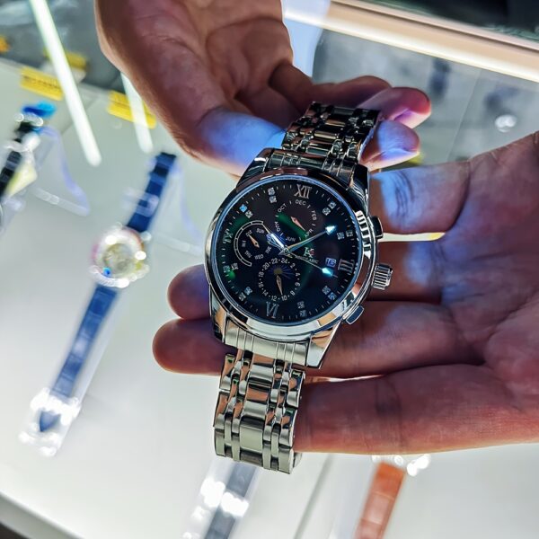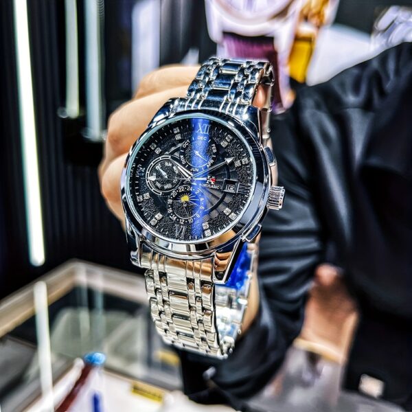 - شاشة عرض متعددة الوظائف ومضيئة: تتميز بعرض التاريخ، اليوم، الشهر، ومؤشر الليل والنهار (الشمس والقمر)، بالإضافة إلى عقارب وعلامات مضيئة لسهولة القراءة في الظلام.