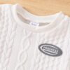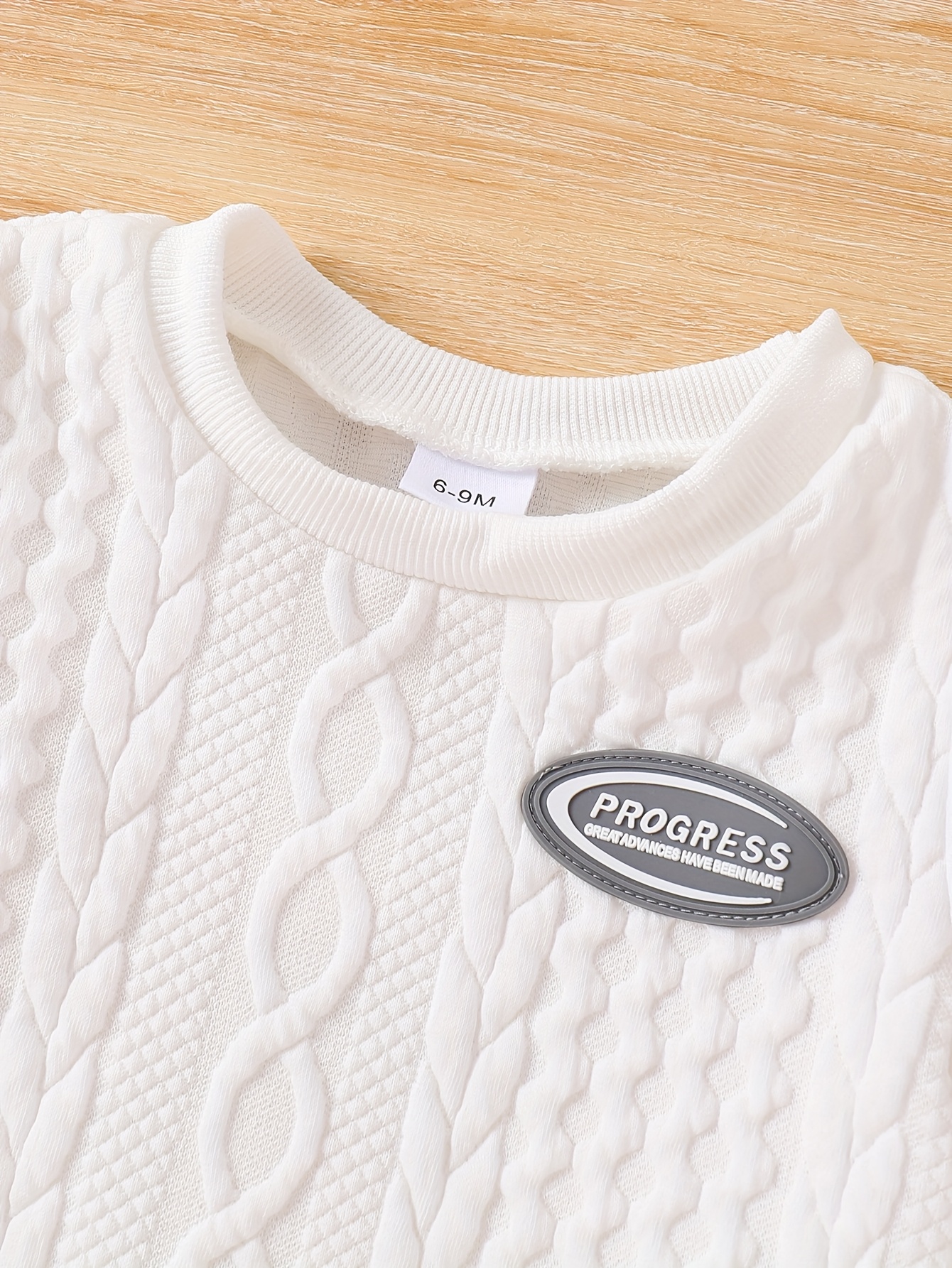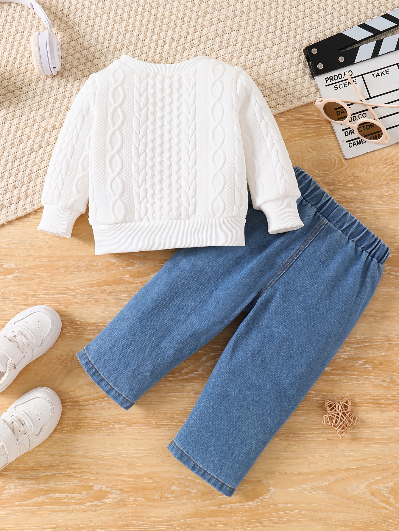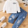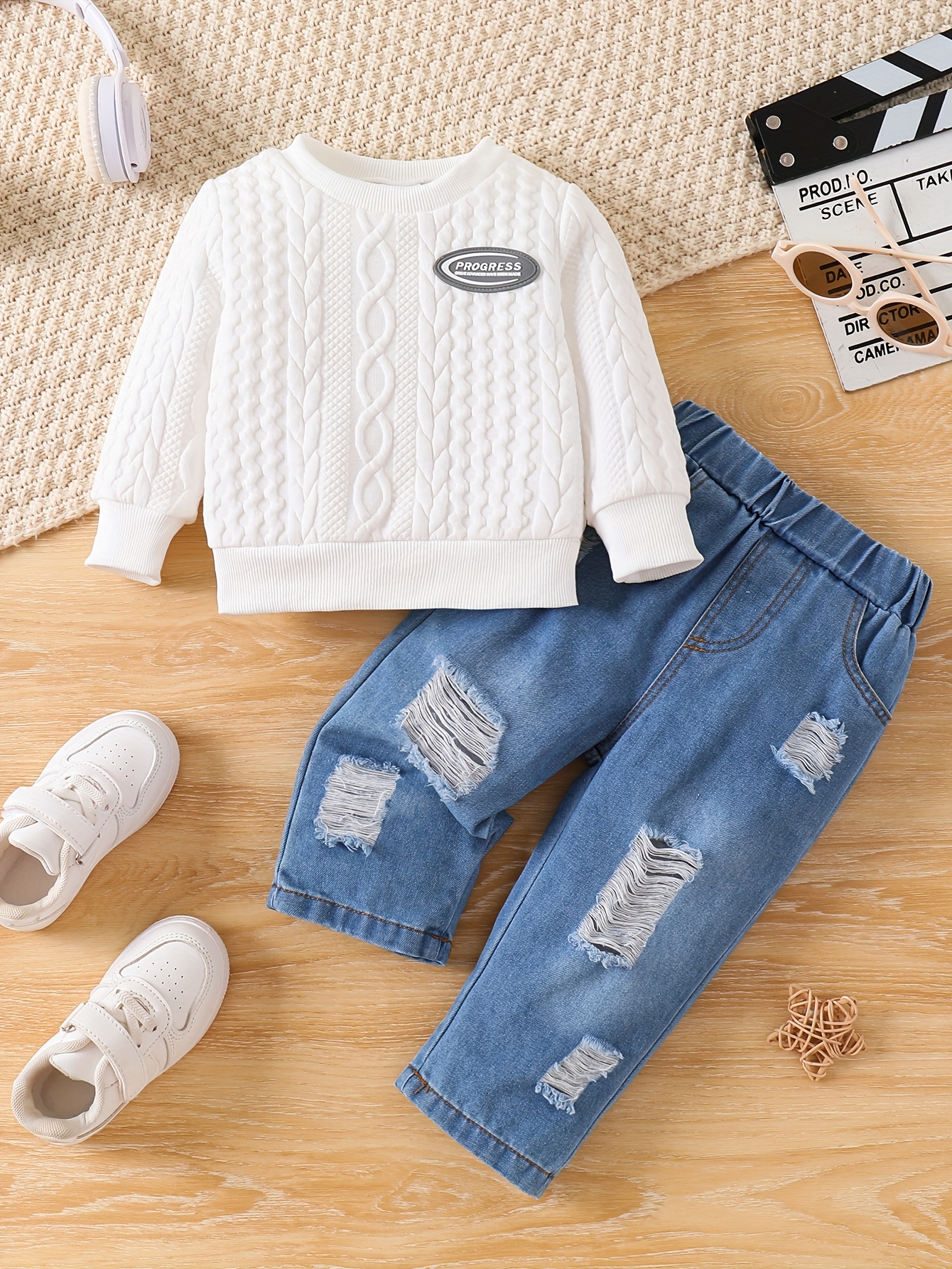 - أناقة لافتة ومميزة: بلوزة أنيقة بأكمام طويلة ورقبة دائرية مع نسيج فريد يضيف لمسة مميزة، وبنطال جينز عصري بتمزقات خفيفة لمظهر جريء ومواكب للموضة يناسب ابنك الصغير.