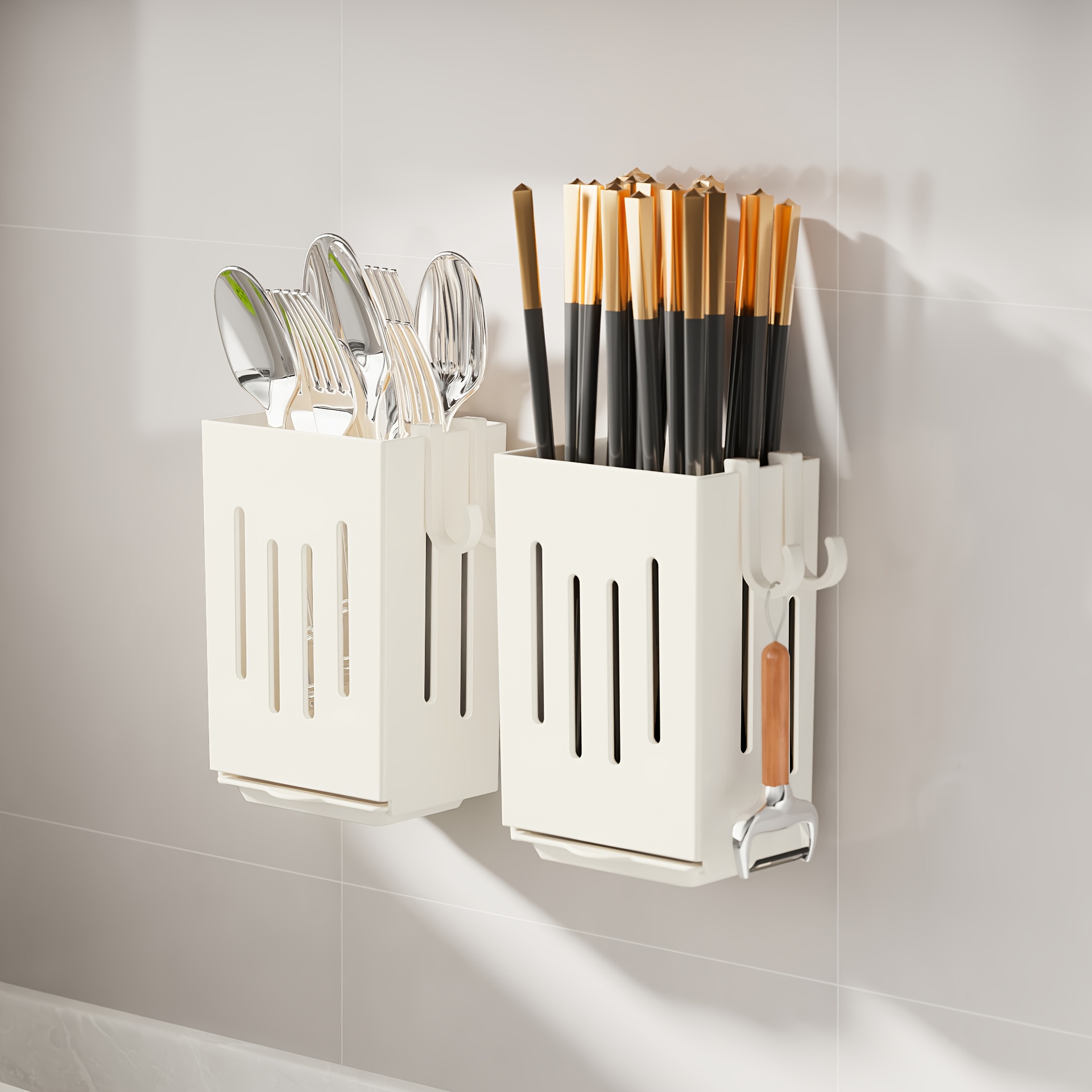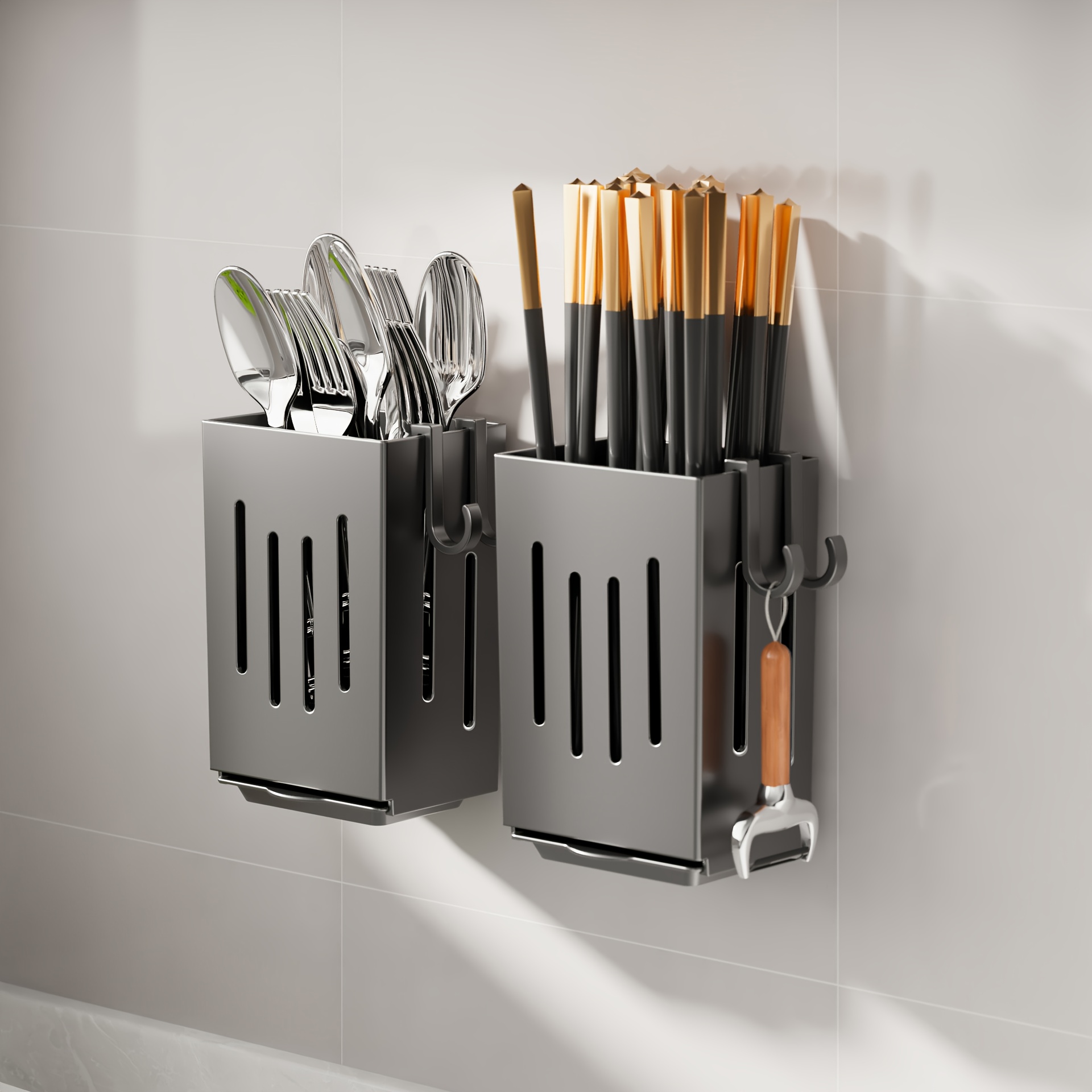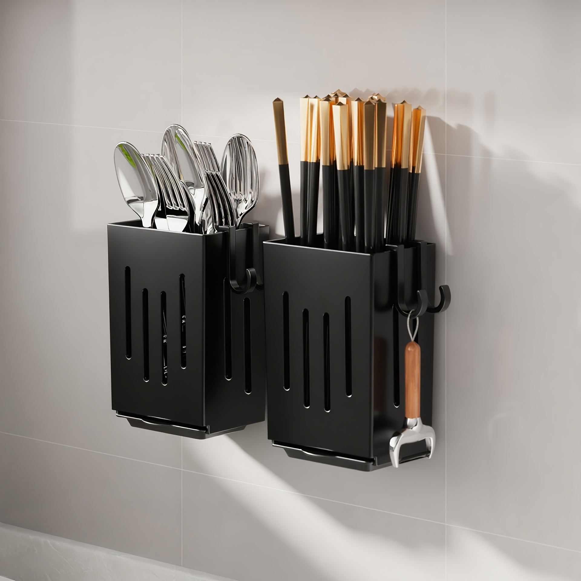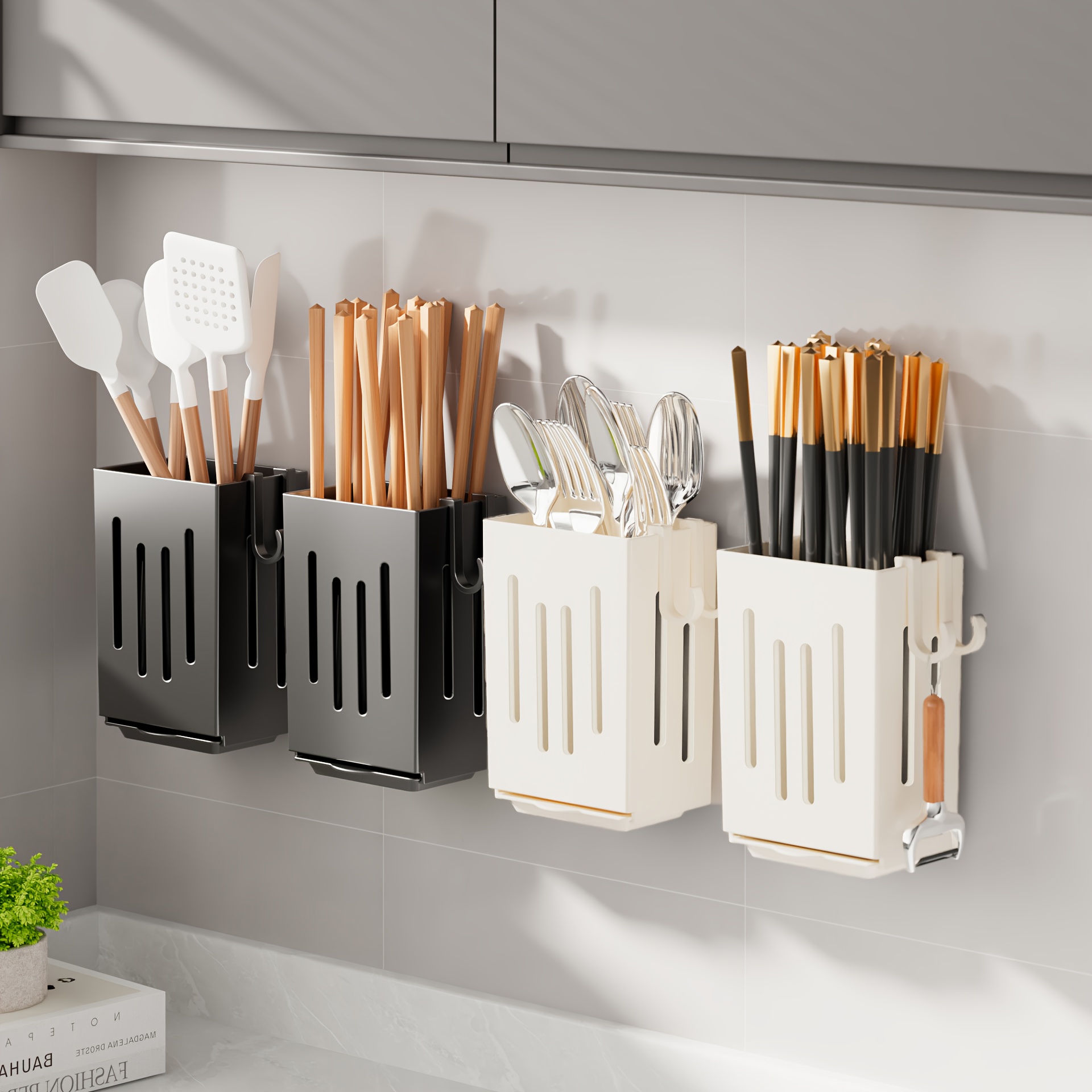 • تخزين متعدد الاستخدامات: مصمم لاستيعاب مجموعة واسعة من الأدوات مثل عيدان تناول الطعام، الشوك، الملاعق، الخفاقات، والملاعق المسطحة (السباتيولا).