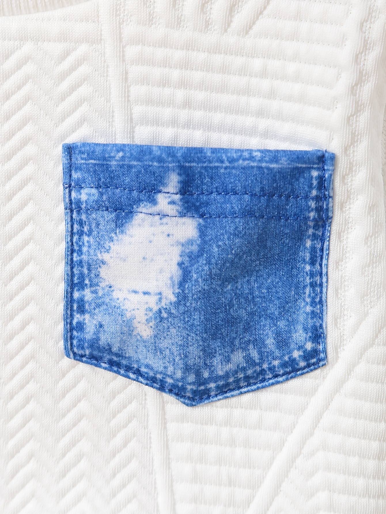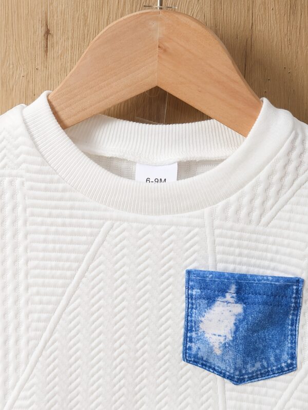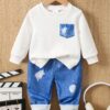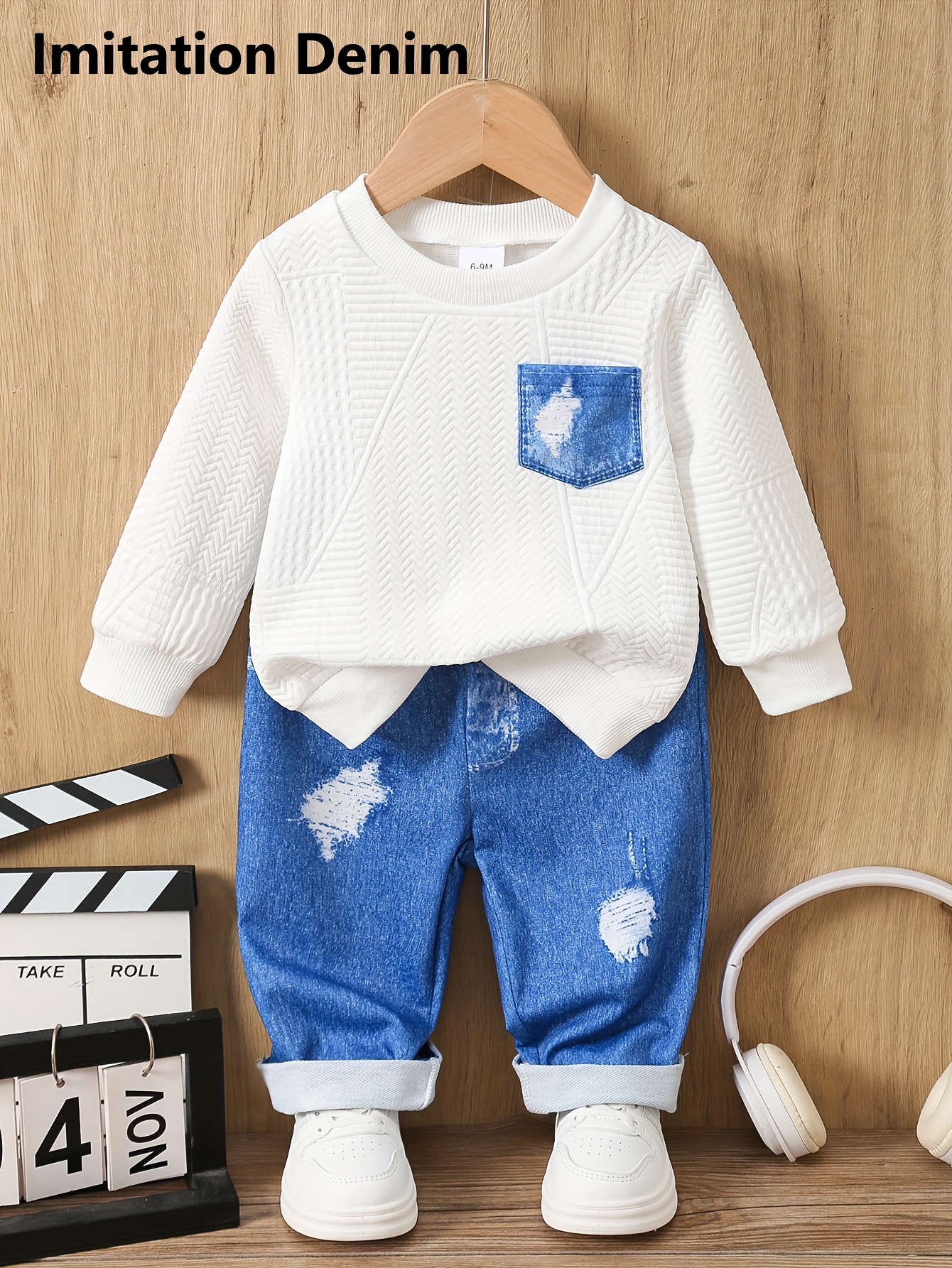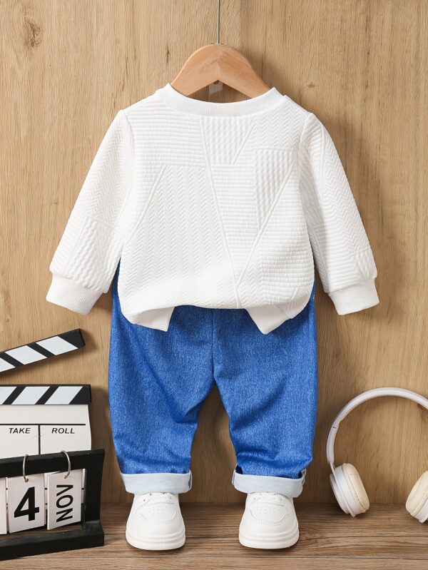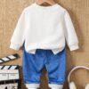 - أناقة لافتة: يجمع هذا الطقم بين سترة صوفية بيضاء ناعمة وبنطال أزرق بتصميم الدنيم العصري، ليمنح طفلك إطلالة أنيقة وعصرية ومناسبة لجميع المناسبات، من اللعب في الحديقة إلى اللحظات الخاصة بالصور.