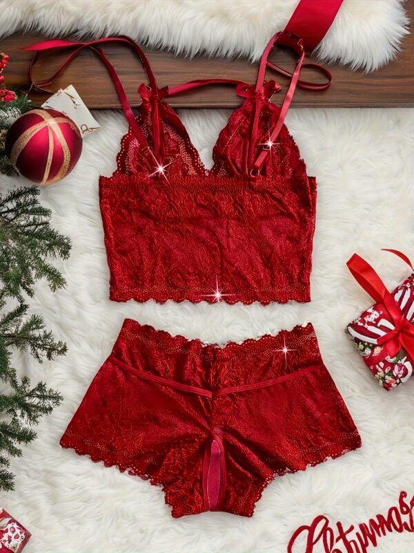 • طقم متكامل من قطعتين: حمالة صدر وسروال داخلي متناسقين تماماً، لإطلالة متكاملة تفيض بالجاذبية والرقي.