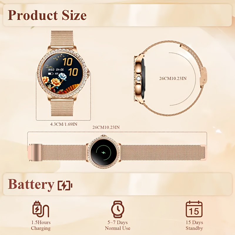 • بطارية قوية وشحن مريح: اعتمدي على بطارية ليثيوم بوليمر قابلة لإعادة الشحن، مع شحن سهل عبر USB، لضمان بقاء ساعتكِ جاهزة دائمًا لمواكبة يومكِ المزدحم.