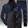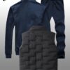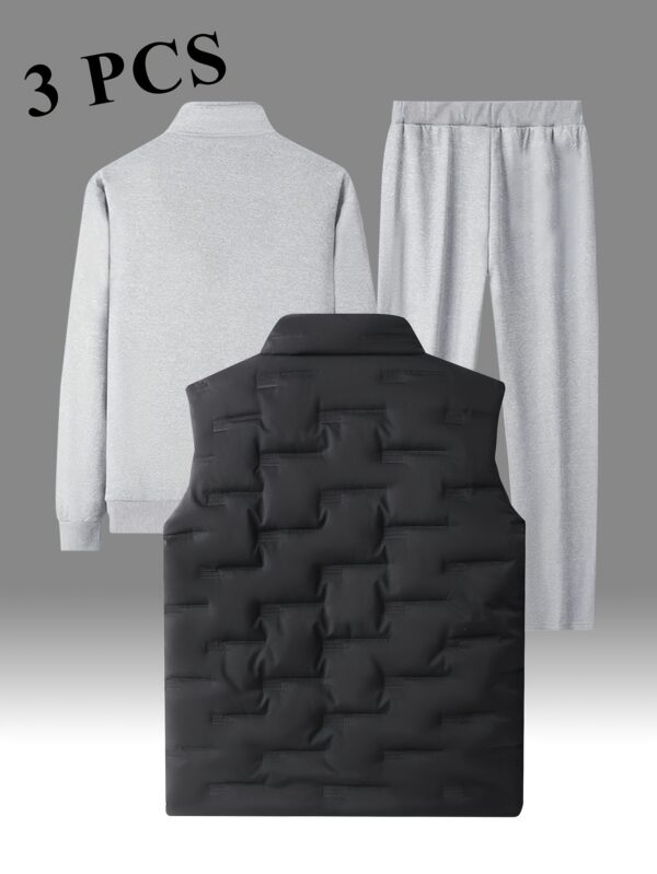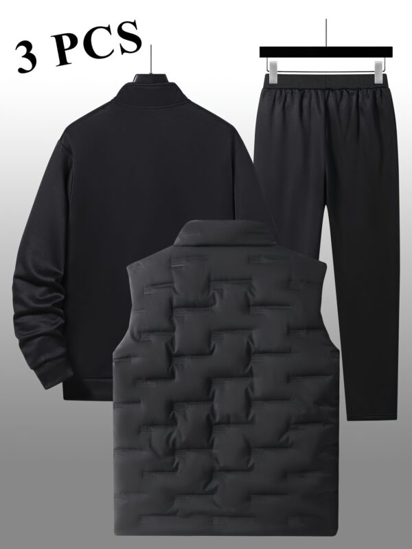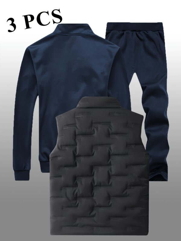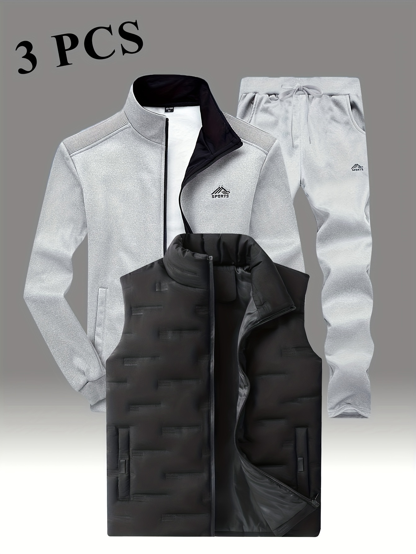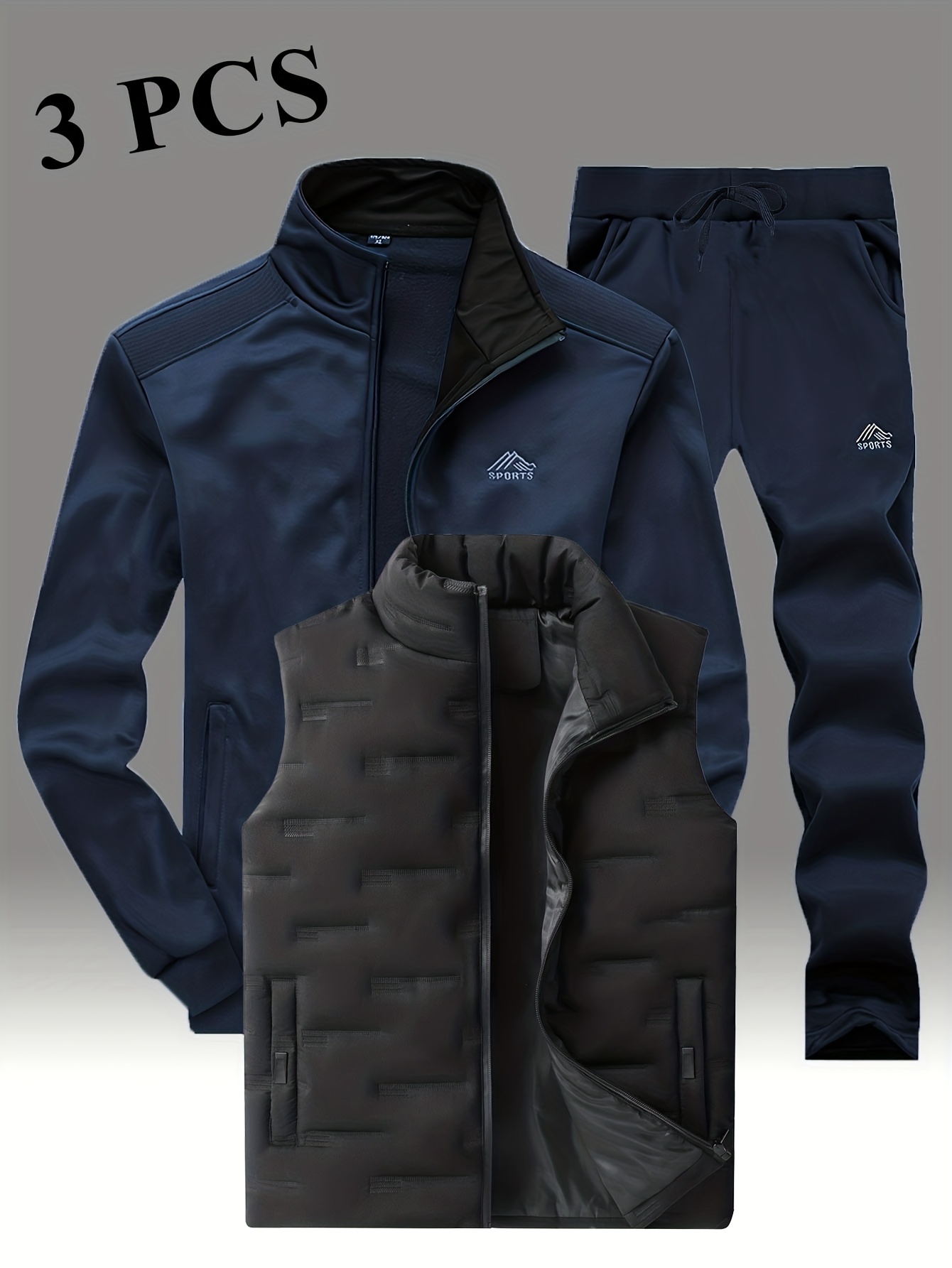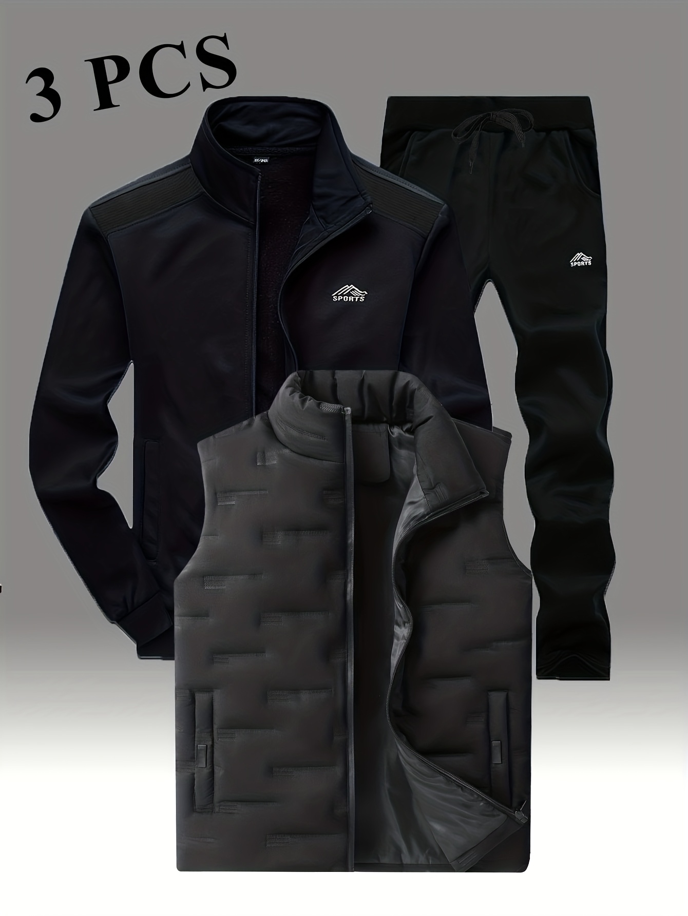 - طقم متكامل من 3 قطع: احصل على جاكيت بسحاب وياقة قائمة، سترة داخلية متناسقة، وبنطلون عصري، جميعها مصممة لتمنحك إطلالة متناسقة ودافئة.