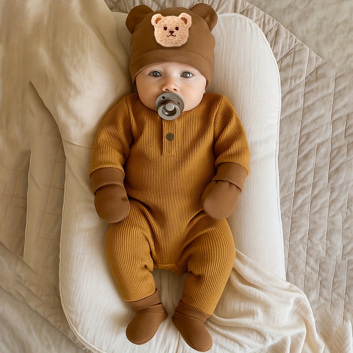 - تصميم كرتوني ساحر: يزينها دب كرتوني لطيف بألوان هادئة (الكاكي)، ليضفي لمسة من البهجة والأناقة على إطلالة صغيركم.