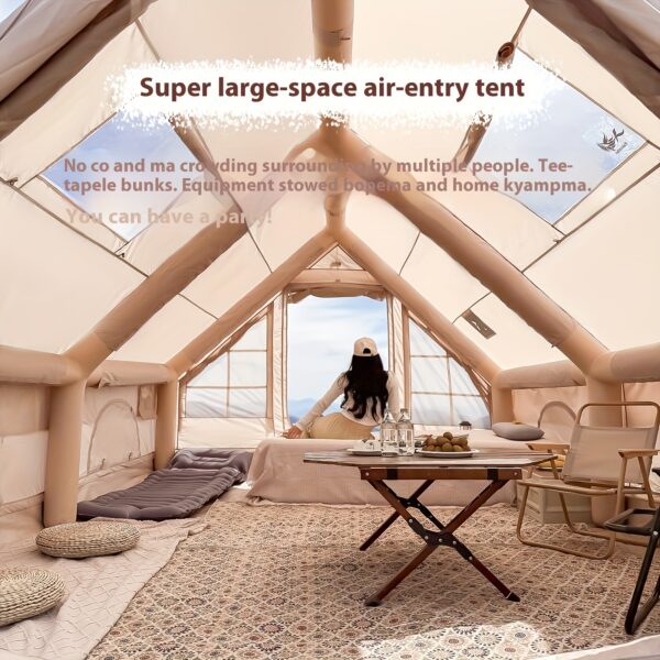 - نظام نفخ هوائي ثوري: انسَ أعمدة التثبيت المعقدة! بفضل نظام النفخ الهوائي المبتكر، يمكنك نصب الخيمة وتجهيزها في دقائق معدودة بكل سهولة ودون أي جهد، لتوفير وقتك الثمين والاستمتاع بالمزيد من لحظات المغامرة.