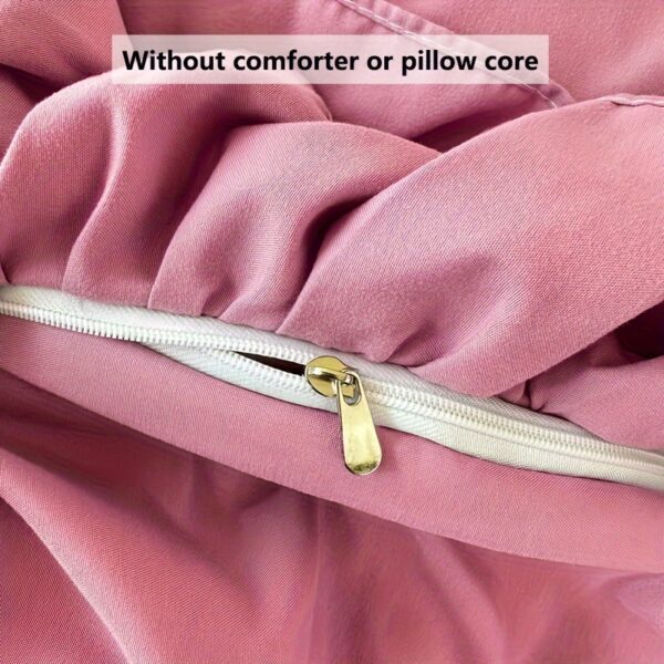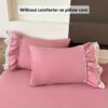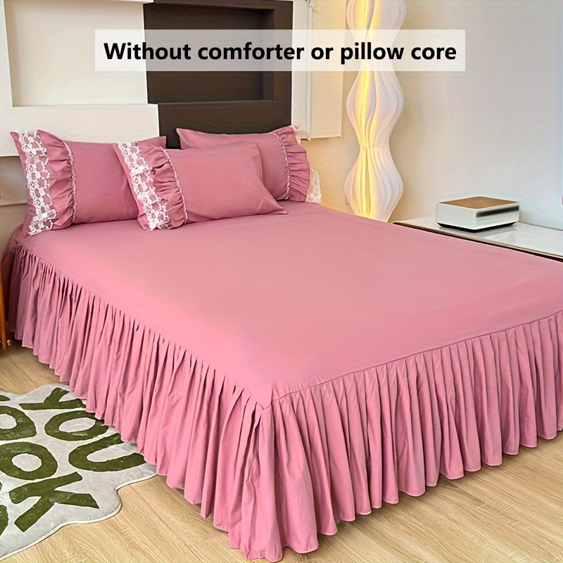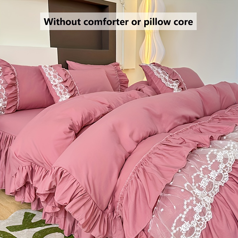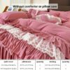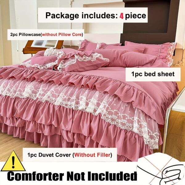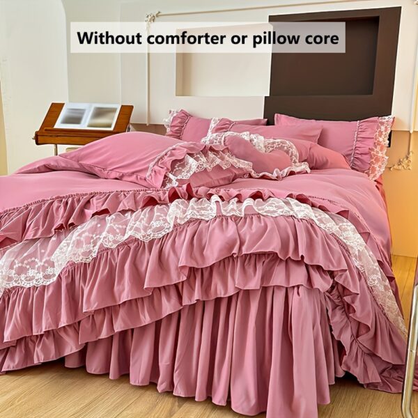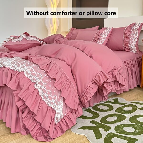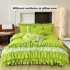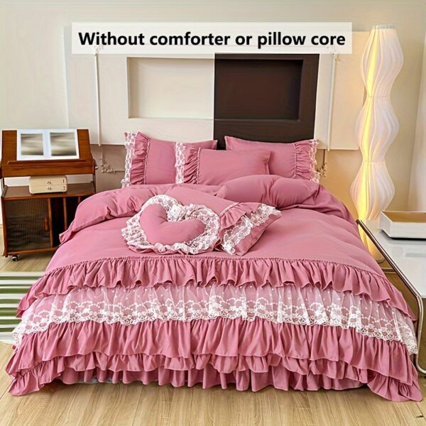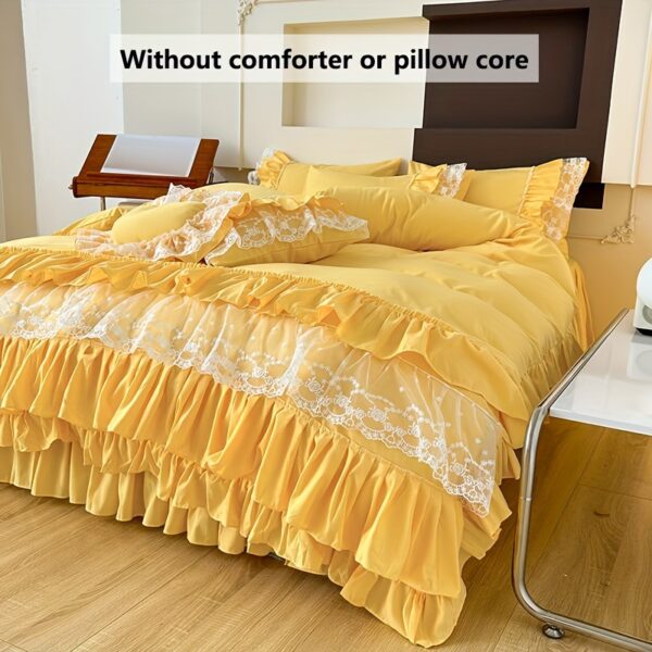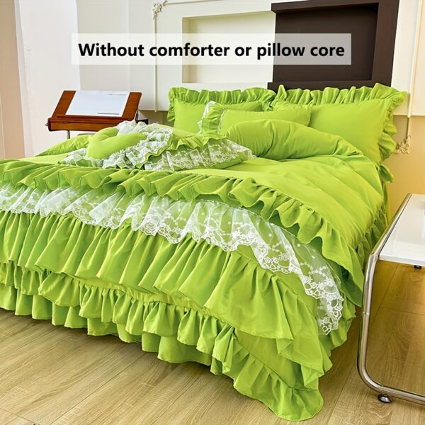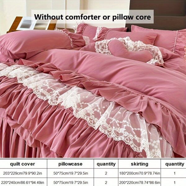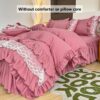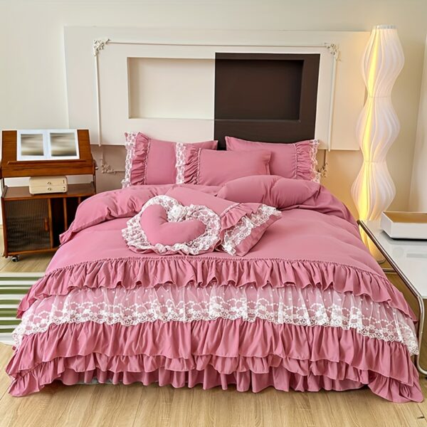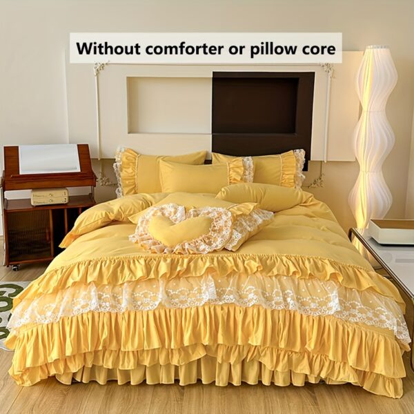 • تصميم ملكي ساحر مع تفاصيل الدانتيل: يزدان الطقم بالدانتيل متعدد الطبقات ليضفي لمسة من الأنوثة والرقي التي تليق بالأميرات. مع لون موحد، يسهل تنسيقه ليناسب أي نمط ديكور ويضفي جواً من الفخامة الهادئة.