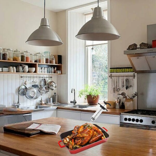 • تصميم عصري وعملي: تتميز بتصميم أنيق ومقبض أحمر مريح، لا يضيف لمسة جمالية لمطبخك فحسب، بل يوفر أيضاً قبضة محكمة ويجعل عملية الحقن سهلة وممتعة.