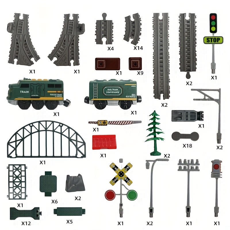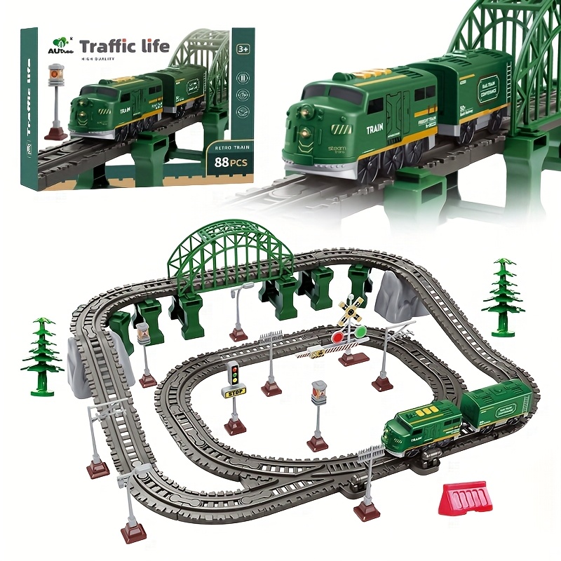 • مجموعة متكاملة وشاملة: تتكون من 88 قطعة بما في ذلك قاطرة كلاسيكية أنيقة ومجموعة واسعة من القضبان التي تسمح بإنشاء مسارات لا نهائية ومعقدة، مما يوفر إمكانيات تصميم واسعة وتجربة بناء ممتعة ومحفزة.