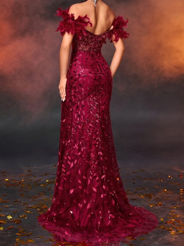 - تفاصيل ريش فاخرة: زينة راقية تضفي لمسة من الفخامة والتميز على إطلالتكِ، لتكوني محط الأنظار.