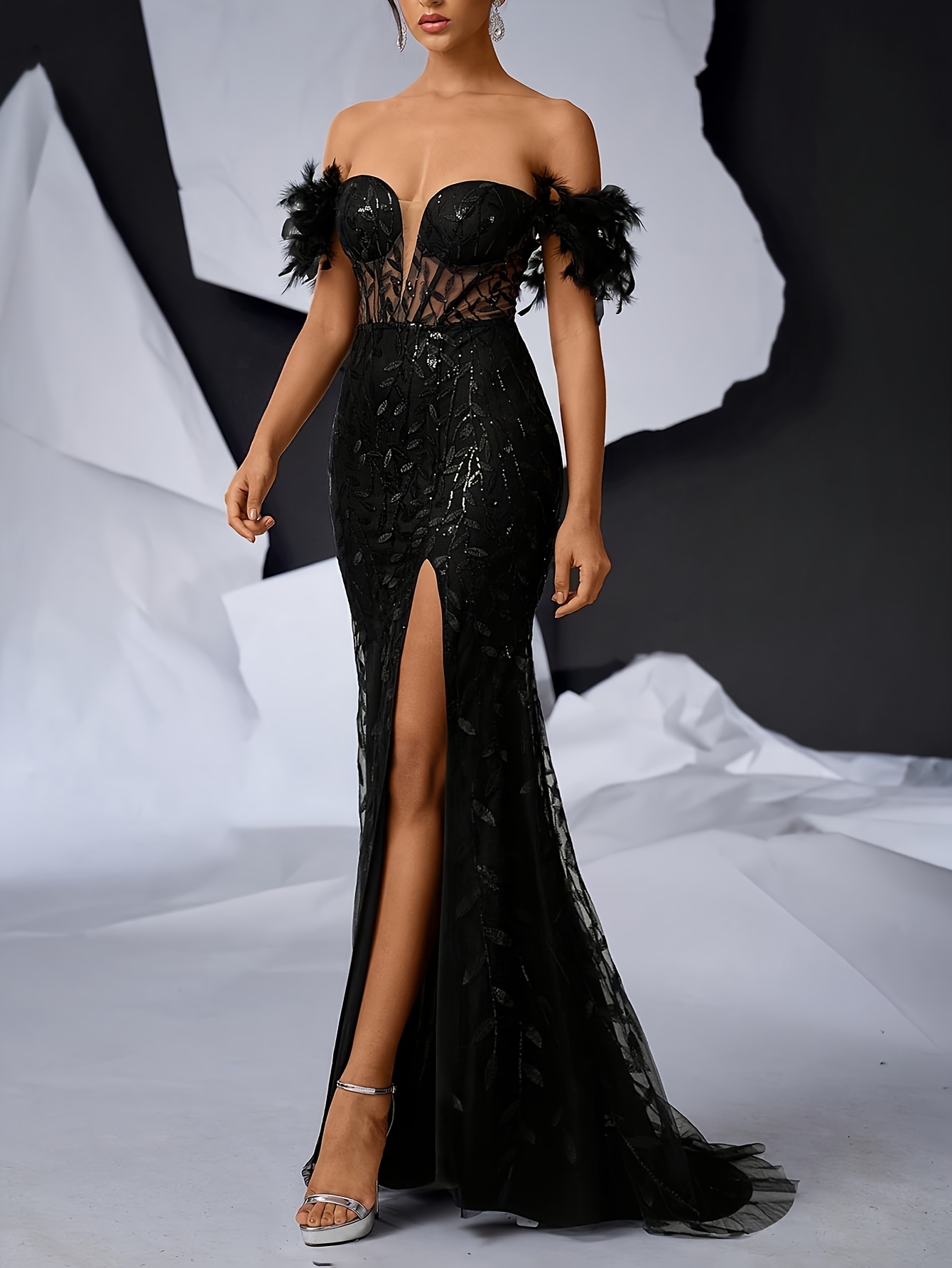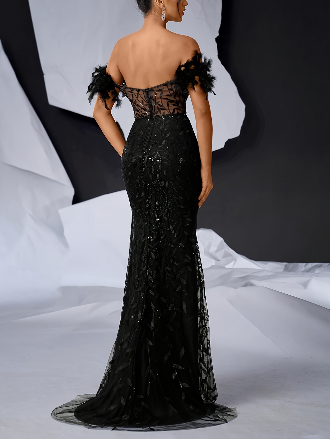- تفاصيل ريش فاخرة: زينة راقية تضفي لمسة من الفخامة والتميز على إطلالتكِ، لتكوني محط الأنظار.