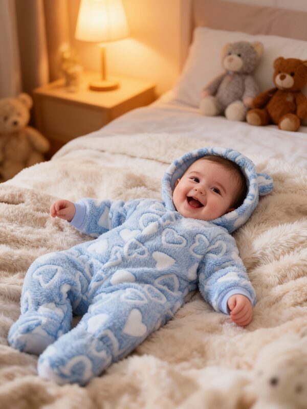 • دفء فاخر ومريح: صُممت من نسيج البوليستر عالي الجودة والمخملي (الفلانيل) الذي يلتف حول طفلك بدفء استثنائي ونعومة فائقة، مما يجعلها مثالية لحماية بشرته الرقيقة في أيام الشتاء والخريف الباردة.