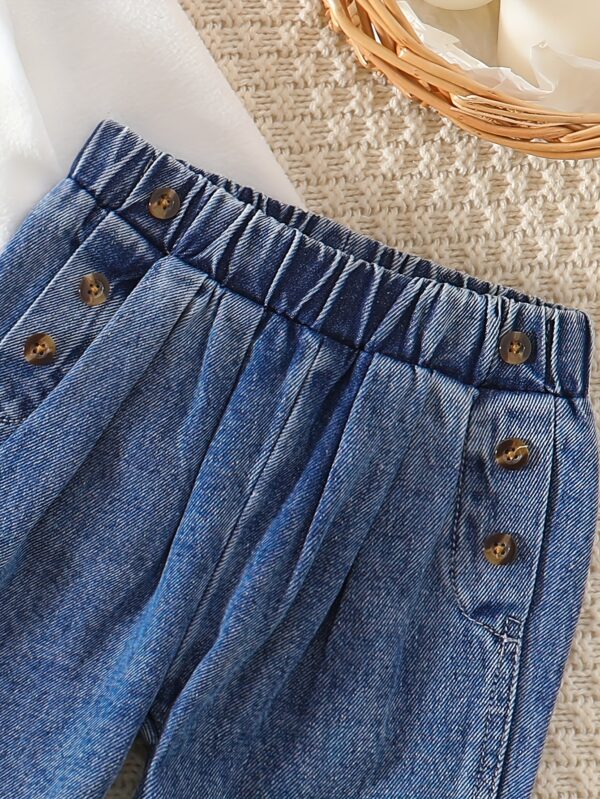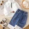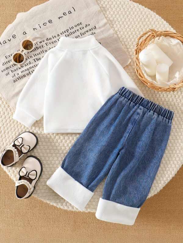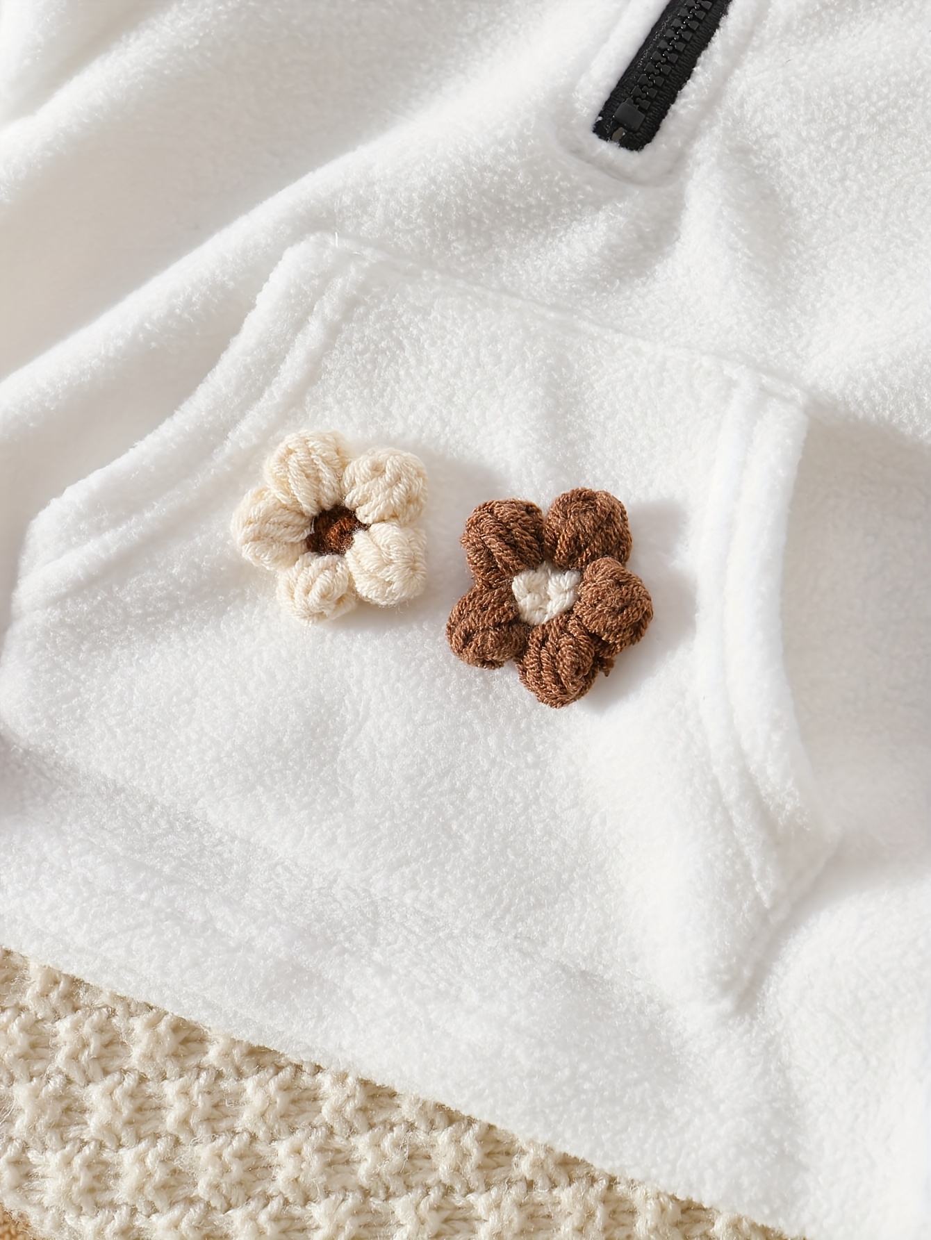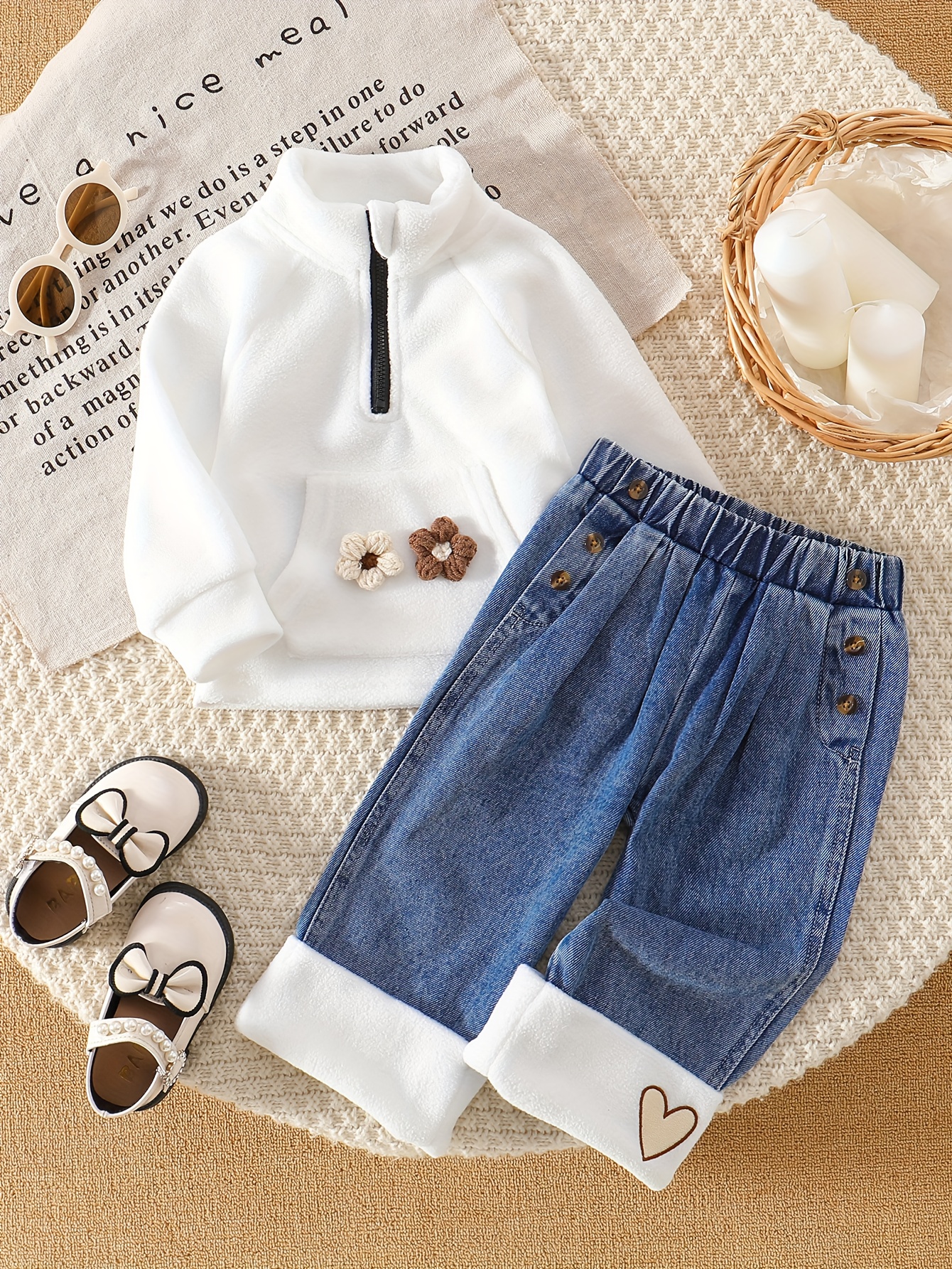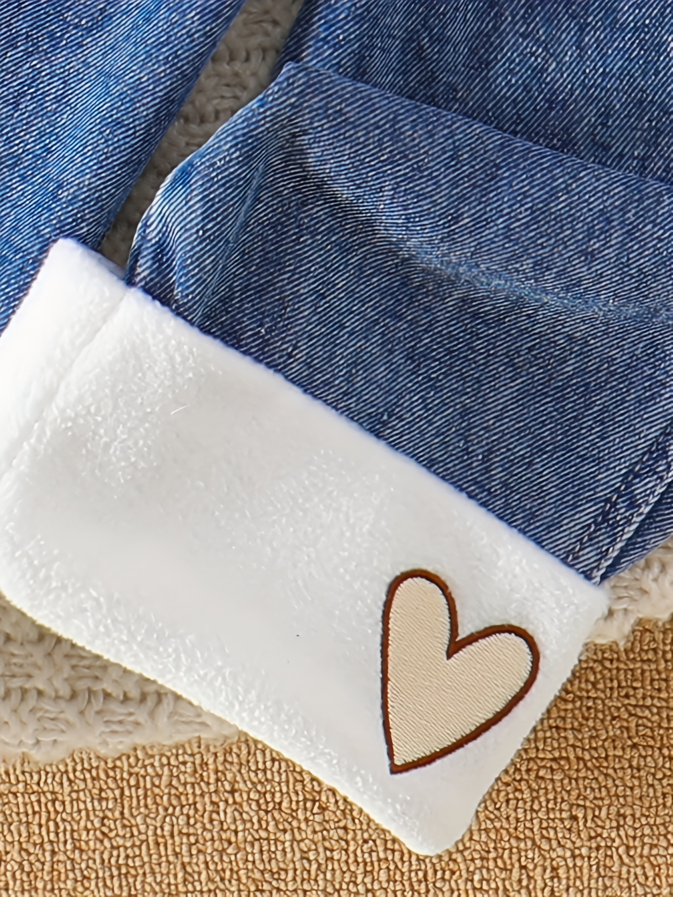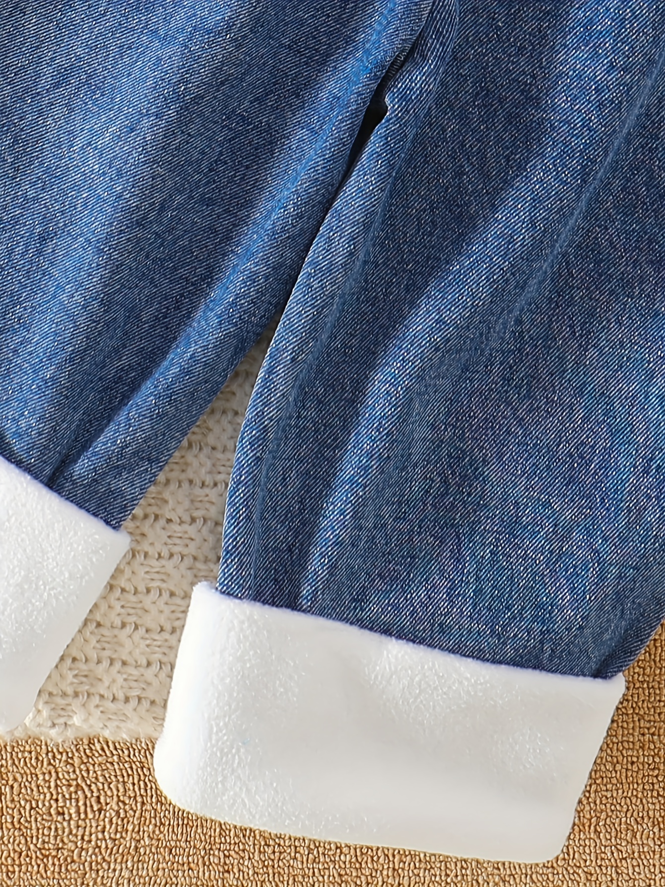 • أناقة عصرية وتفاصيل ساحرة: تصميم أنيق وعصري يجمع بين بلوزة مبطنة بالفرو وبنطال جينز مزين بتطريزات زهور رقيقة، مما يضفي على إطلالة طفلتك جاذبية فريدة ومظهرًا مبهجًا يناسب فصلي الخريف والشتاء.