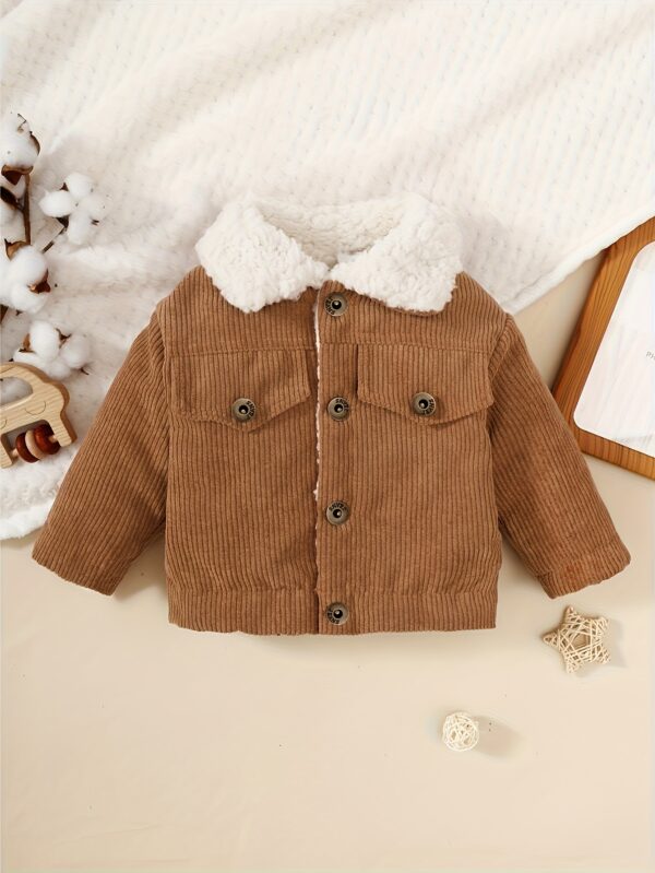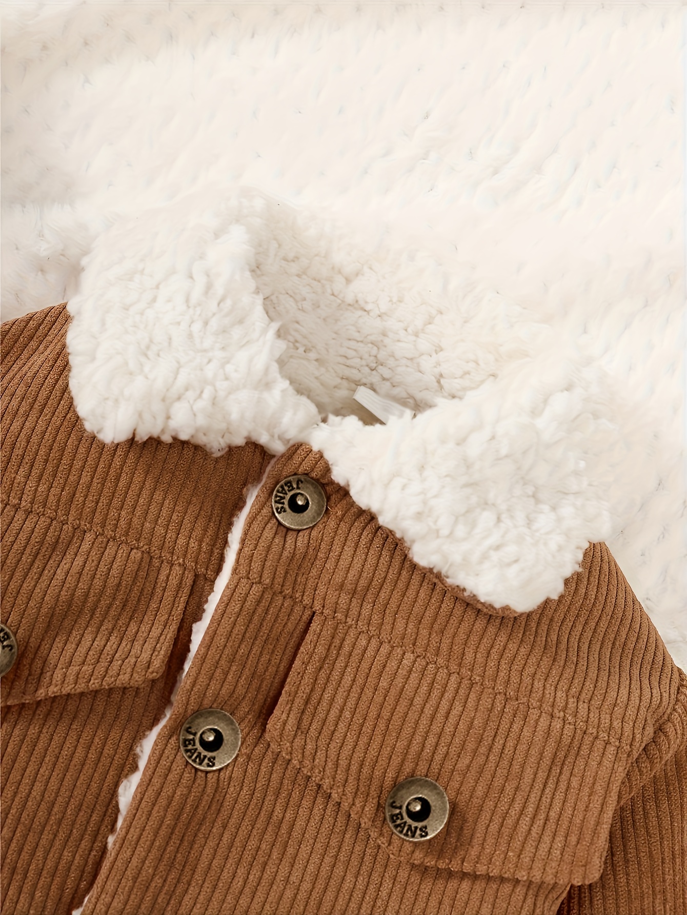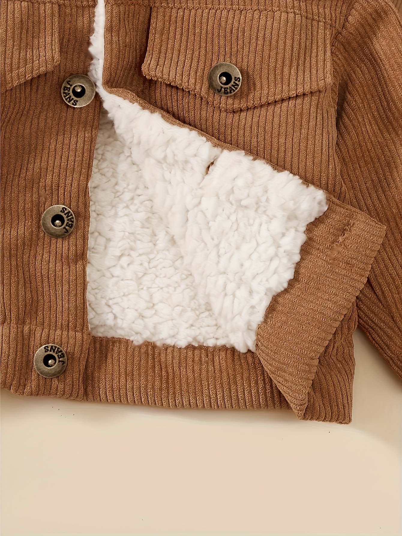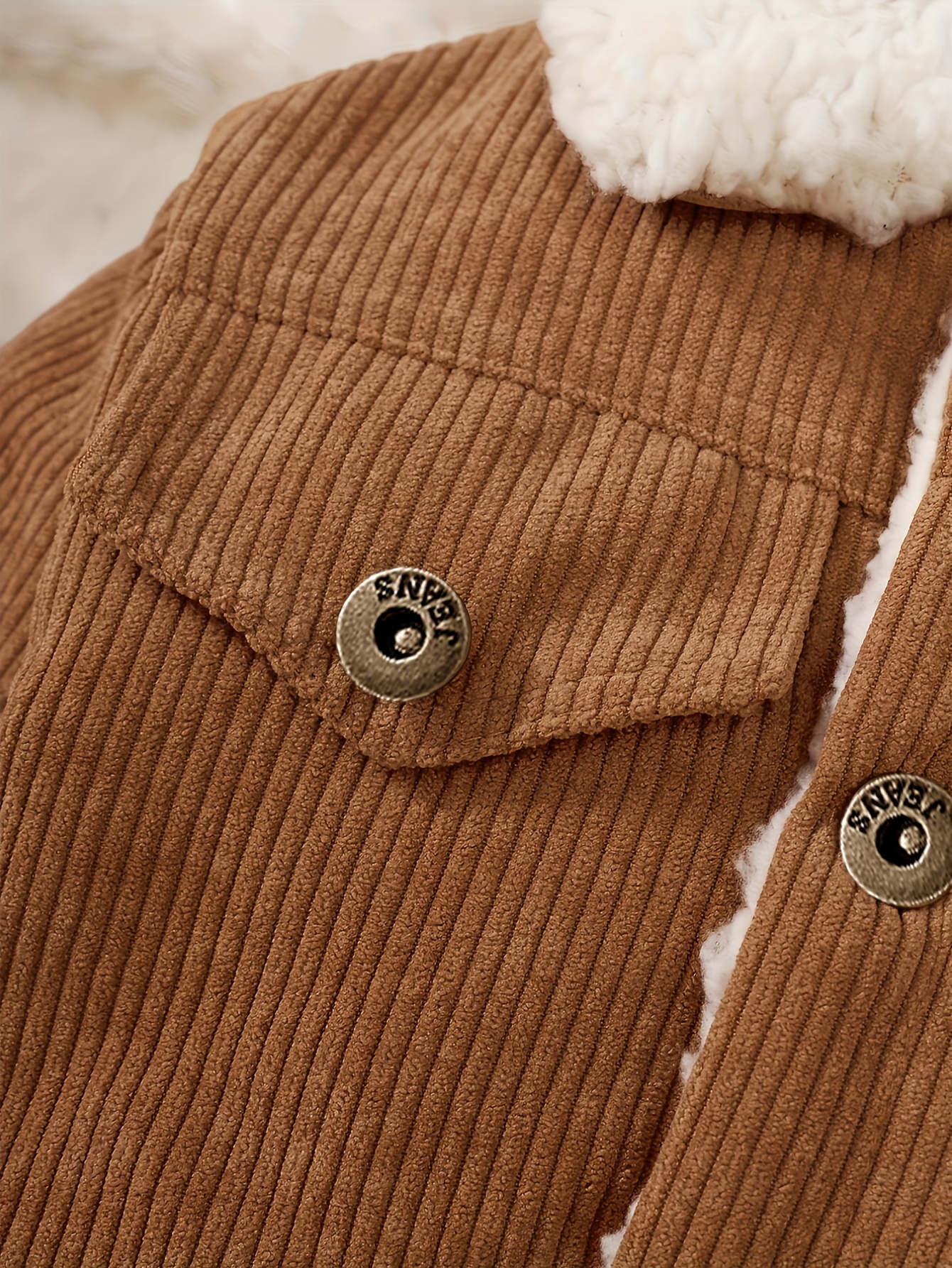 اجعلي شتاء صغيرتك قصة دفء وأناقة لا تُنسى مع جاكيت الكوردروي الفاخر هذا. مصمم خصيصًا ليمنح أميرتك الصغيرة الحماية المثالية من البرد، مع لمسة من الجاذبية التي تخطف الأنظار في كل مناسبة.