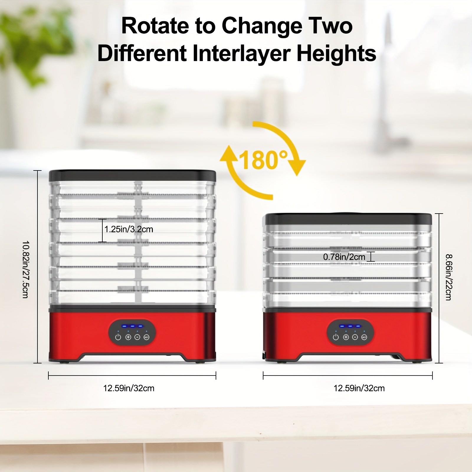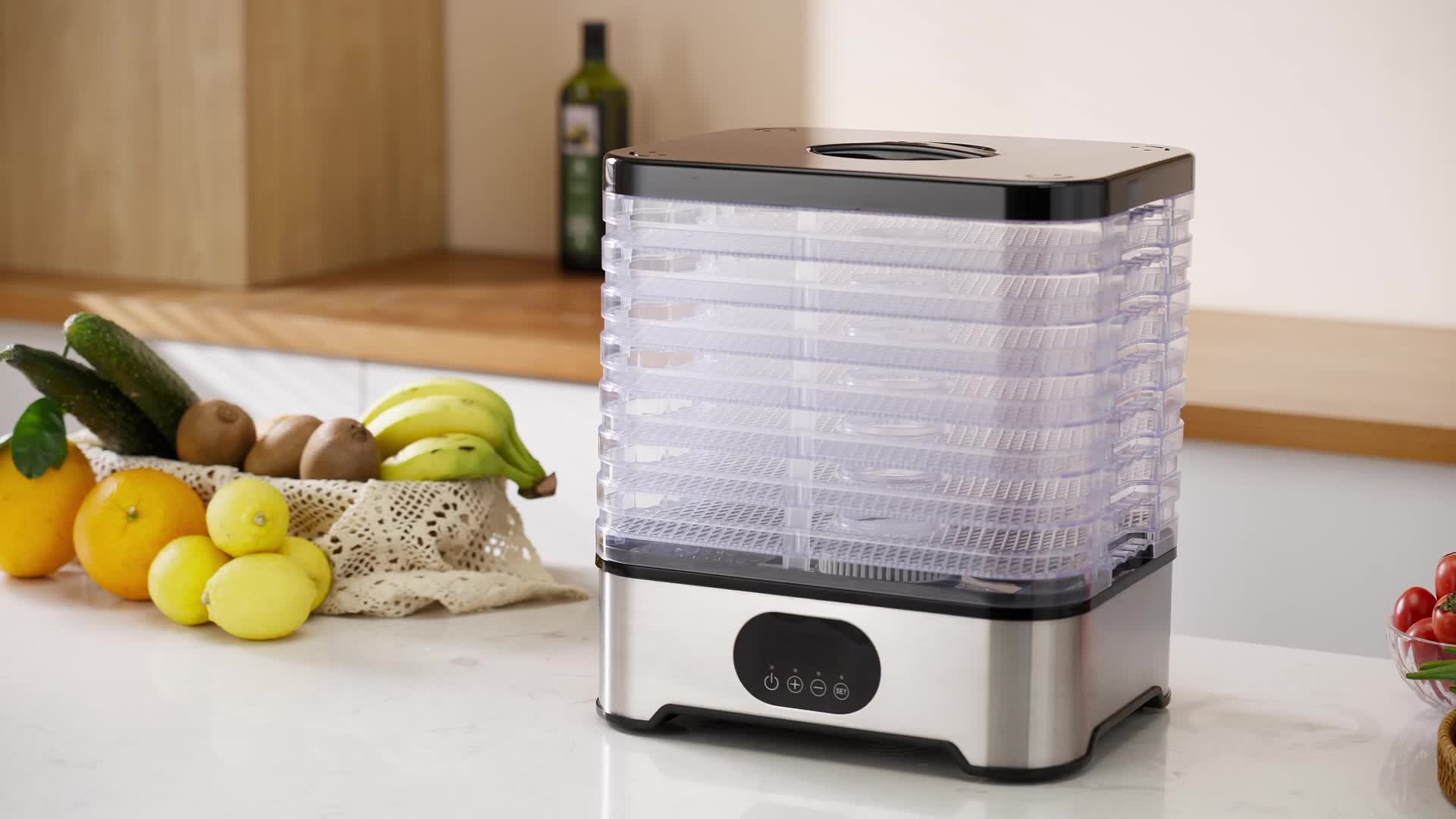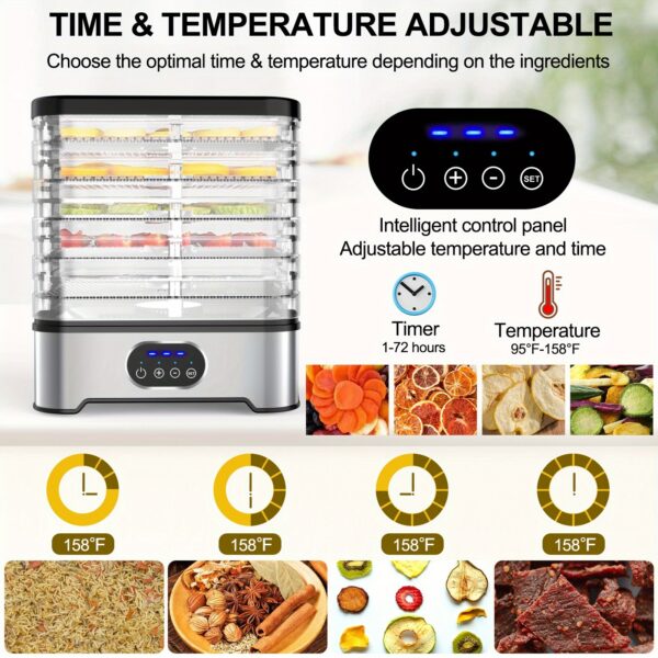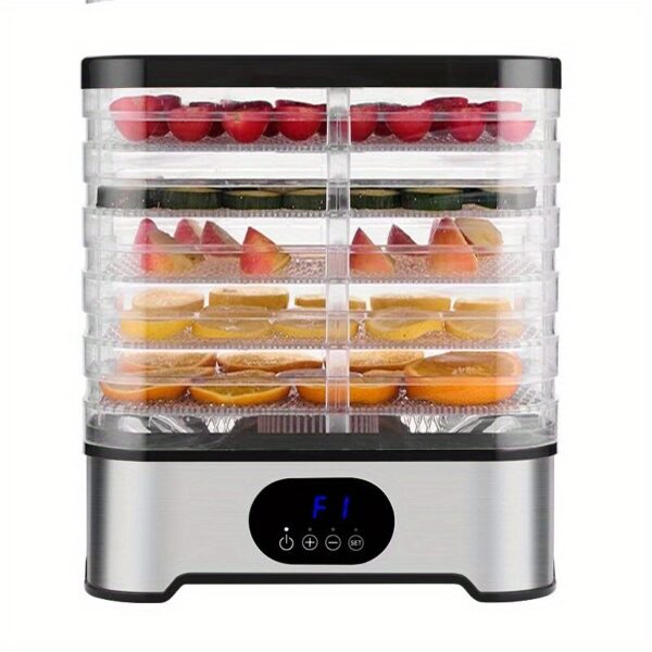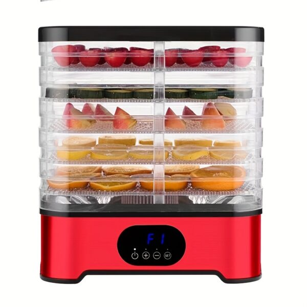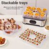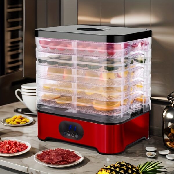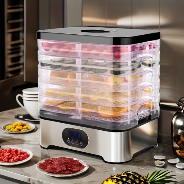 - تصميم واسع بخمس طبقات: استمتع بمساحة تجفيف وفيرة تسمح لك بإعداد كميات كبيرة من الأطعمة المتنوعة في آن واحد، من الفاكهة والخضروات إلى اللحوم المجففة (القديد) والمكسرات، وحتى تحضير مكافآت شهية لحيوانك الأليف بكل سهولة.