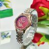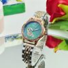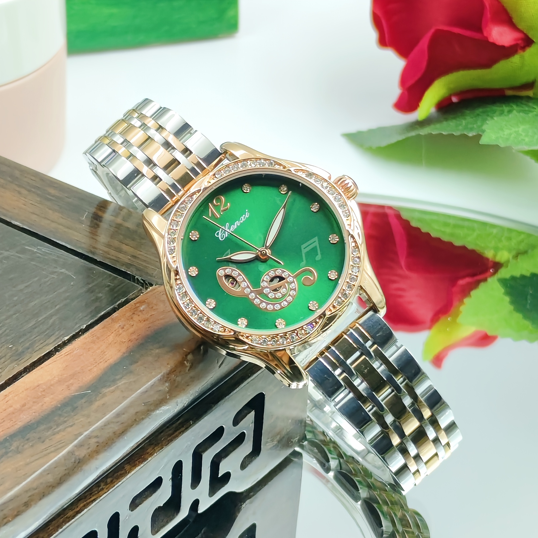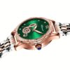 • تصميم آسر وألوان جذابة: تتميز الساعة بقرصها الأخضر الزمردي الأنيق الذي يتناغم بشكل مثالي مع الحزام بلون الذهب الوردي الساحر، مما يمنحكِ إطلالة ملكية عصرية وجذابة.