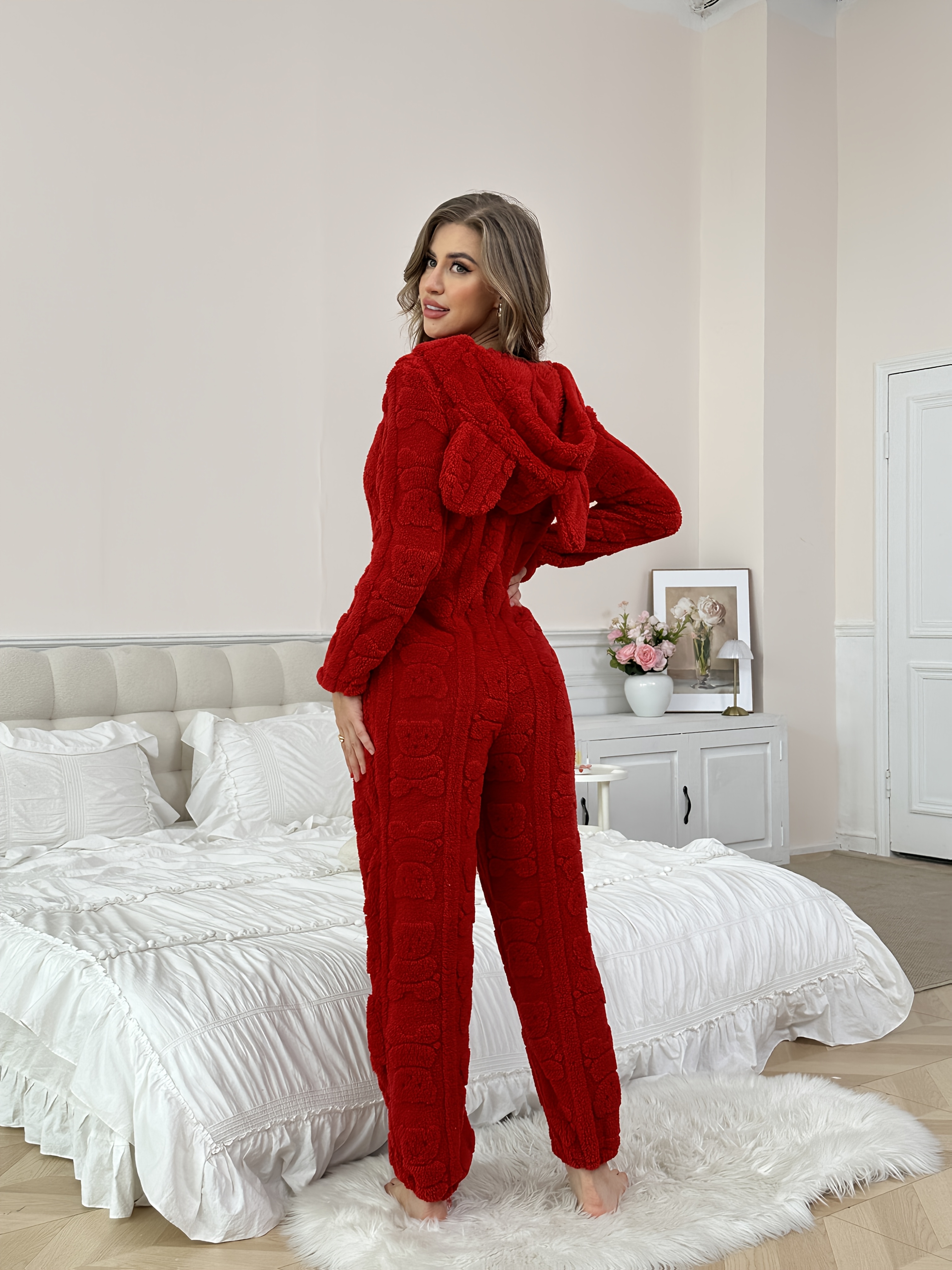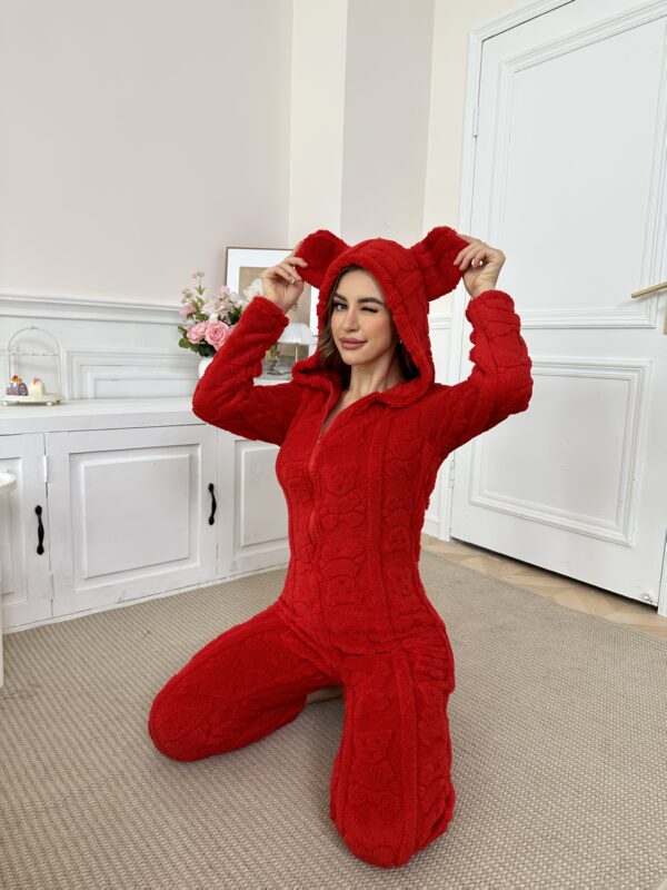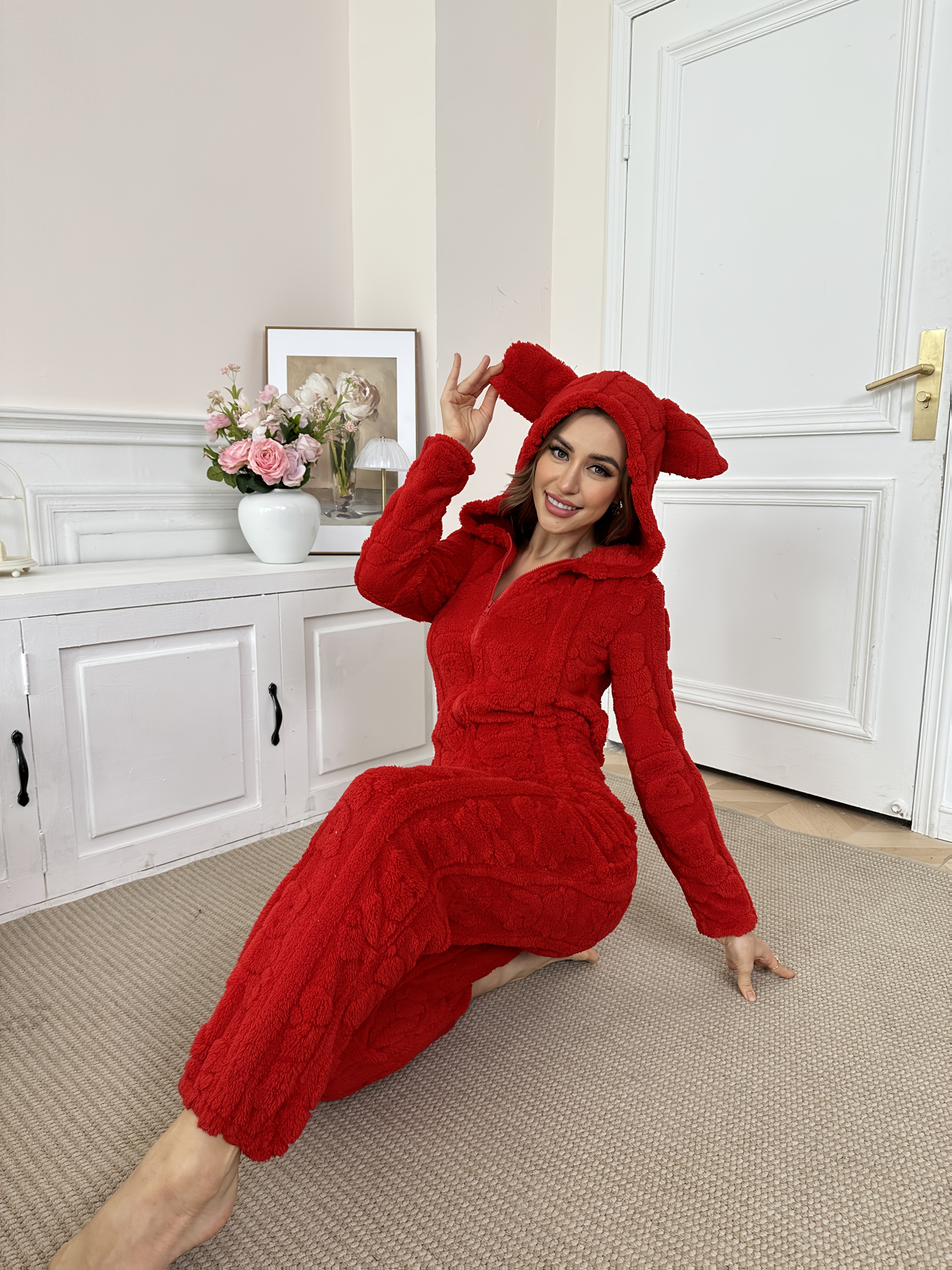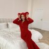 - تصميم ساحر ومريح: تتميز البيجاما بأذني أرنب لطيفة وقبعة دافئة تمنحكِ إطلالة مرحة ومريحة في آن واحد، مثالية لأوقات الاسترخاء المنزلية أو النوم الهادئ.