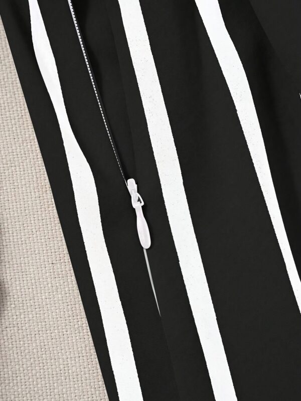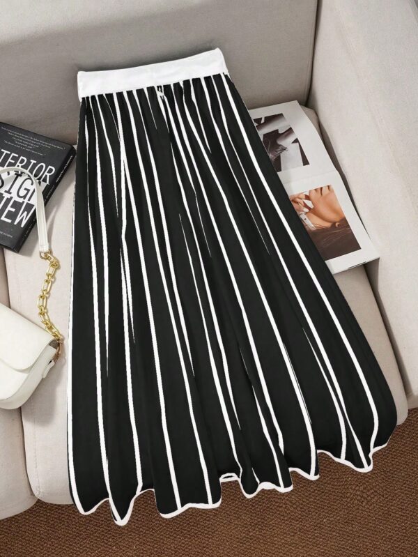 • تصميم أنيق وجذاب: تتميز هذه التنورة بقصة ميدي مخططة بالأبيض والأسود، تضفي لمسة من الرقي الكلاسيكي بأسلوب عصري يناسب مختلف الأذواق.