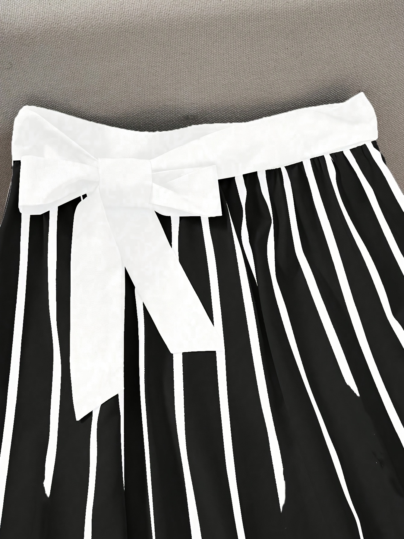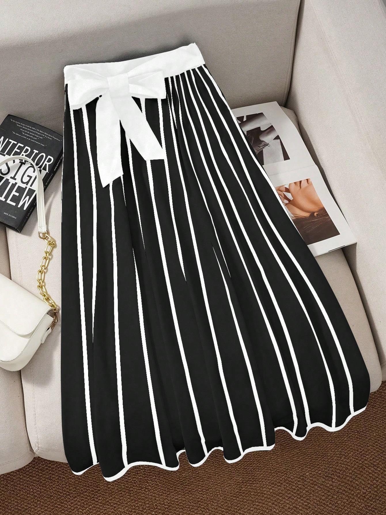 تنورة ميدي مخططة: أناقة عصرية بخصر عالٍ وتفصيلة ربطة أمامية