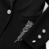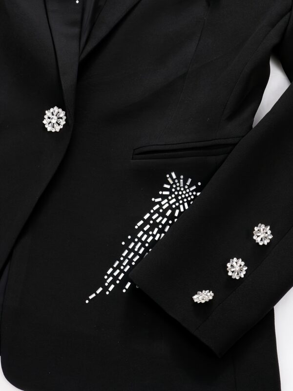 - التصميم الفاخر: يتميز الطقم بترصيعات راقية من أحجار الألماس اللامعة التي تضفي لمسة من البريق والسحر، بالإضافة إلى بنطال بقصة واسعة (Flared Pants) تمنحكِ حركة مريحة وإطلالة عصرية.