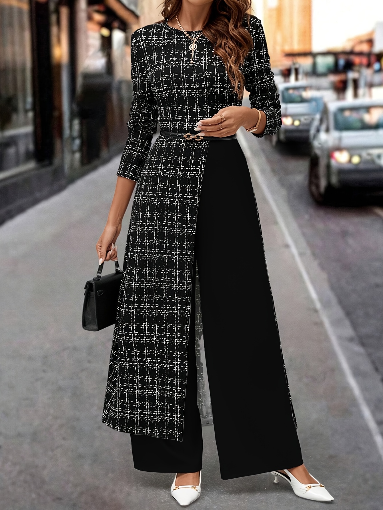 اكتشفي قمة الأناقة والراحة مع هذا الجمبسوت النسائي الرائع، المصمم ليمنحك إطلالة فريدة ومتميزة في كل مناسباتك. يجمع هذا التصميم بين الطابع الكلاسيكي لنقشة الكاروهات ولمسة عصرية جريئة بفضل قصته غير المتماثلة، مما يجعله قطعة لا غنى عنها في خزانة ملابسك.