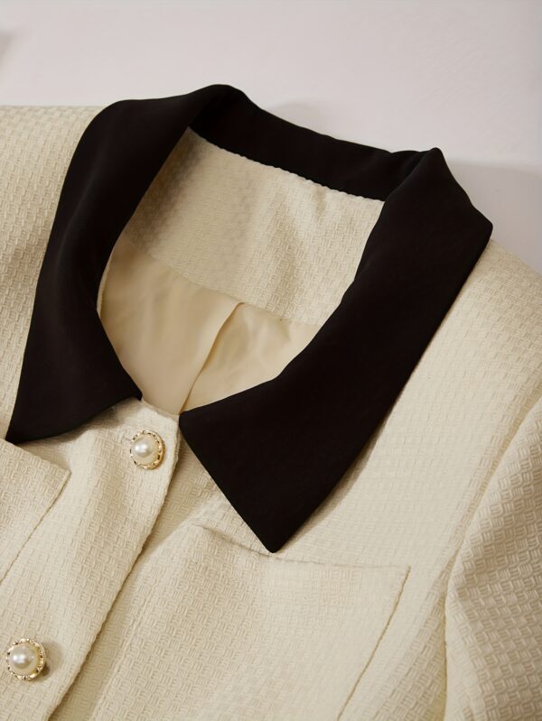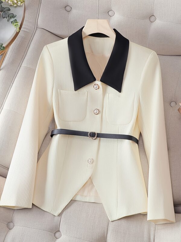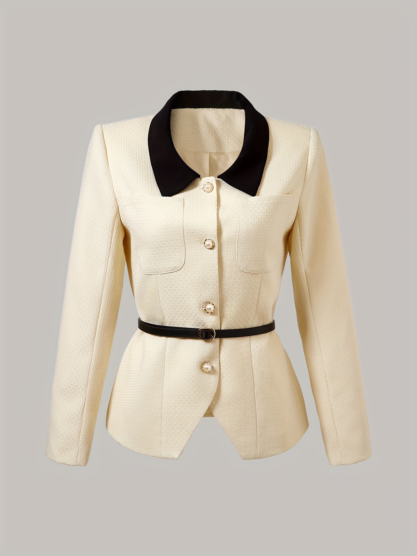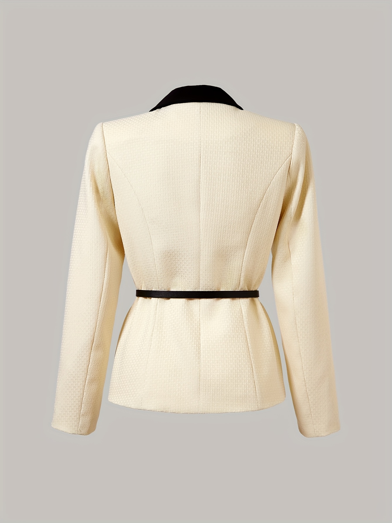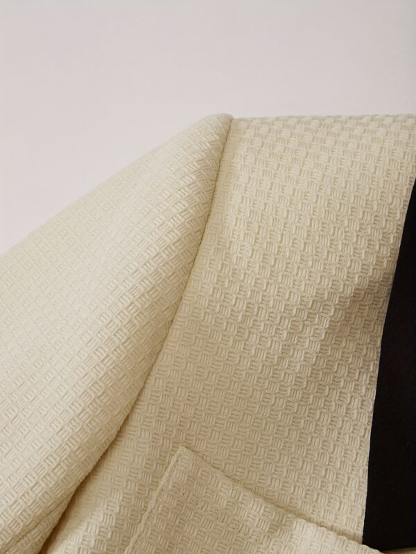 - تصميم فريد وعصري: يتميز البليزر بقصة جاكار مميزة مع ياقة متباينة الألوان تضفي لمسة عصرية وجذابة، مما يجعله قطعة فريدة تبرز ذوقك الرفيع.
