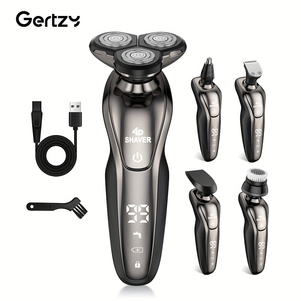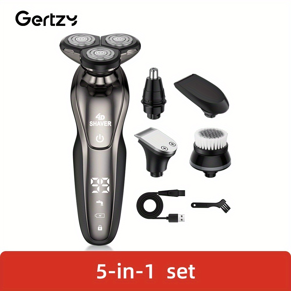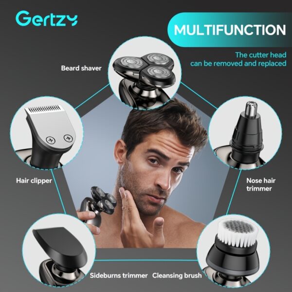 - تعدد الاستخدامات 5 في 1: لا تكتفِ بالحلاقة فقط! بفضل رؤوسها القابلة للتبديل، توفر لك GERTZY 5 في 1 تجربة عناية متكاملة تشمل حلاقة وتشذيب اللحية، تحديد السوالف، وتقليم شعر الأنف والأذن بدقة متناهية، كل ذلك في جهاز واحد أنيق.