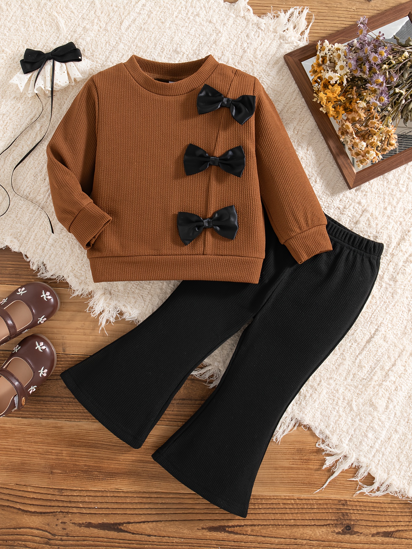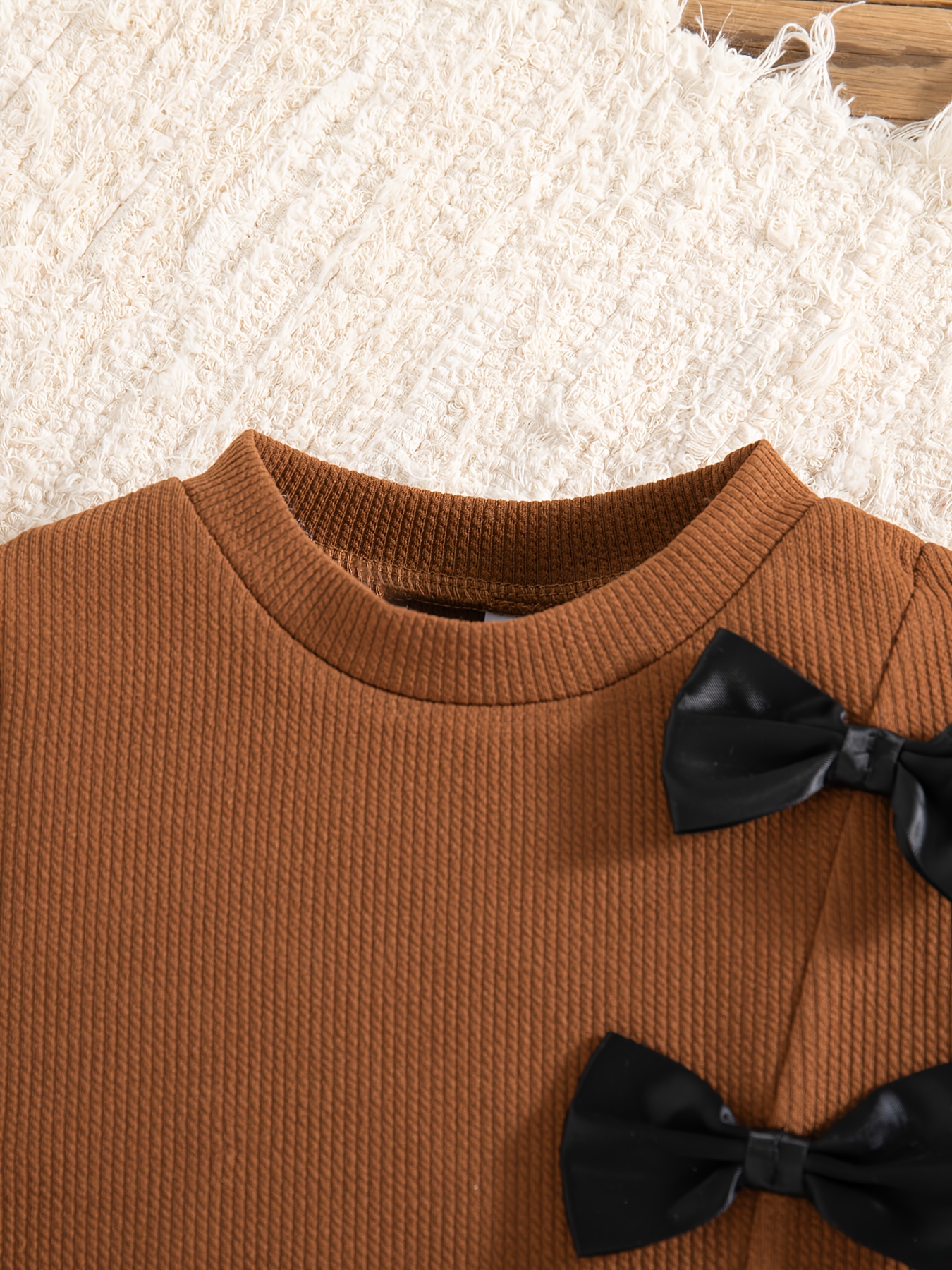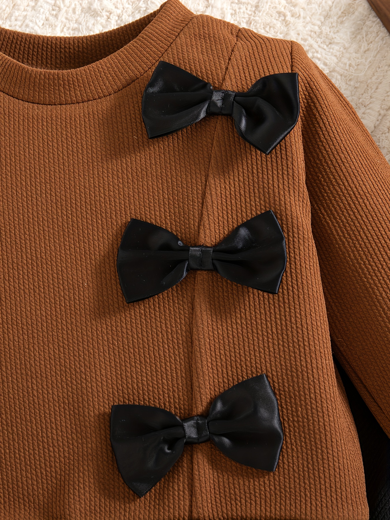 - تصميم أنيق وجذاب: تتميز البلوزة بتفصيلة فيونكة سوداء ساحرة، ويأتي البنطال بلون أسود سادة وقصة واسعة قليلاً، مما يخلق إطلالة متكاملة وعصرية تجعل صغيرتكِ محط الأنظار.