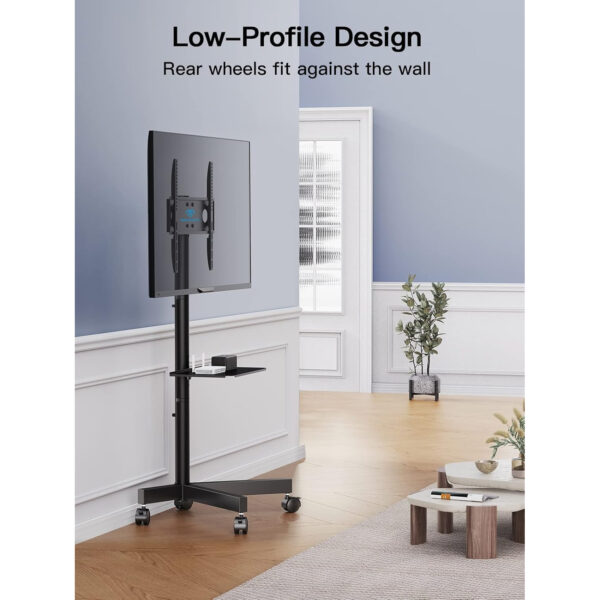 • مرونة التنقل المطلقة: بفضل العجلات القوية والسلسة، يمكنك تحريك شاشتك الكبيرة بسهولة تامة إلى أي مكان تريده، من غرفة المعيشة إلى قاعة الاجتماعات أو حتى الفناء الخلفي، لتستمتع بمشاهدة متواصلة بلا قيود.