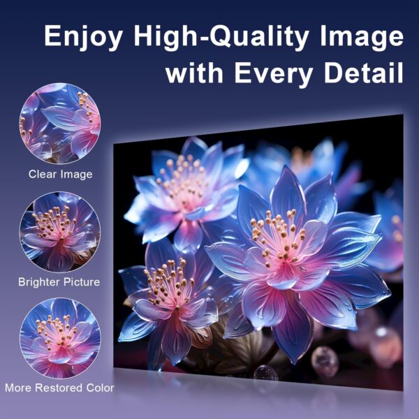 - سطوع مذهل ووضوح عالٍ: شاهد كل التفاصيل بوضوح مدهش، حتى في البيئات ذات الإضاءة المحيطة، مما يضمن لك تجربة مشاهدة غامرة وممتعة في أي وقت وفي أي مكان. استمتع بألوان نابضة بالحياة وتباين عميق يضفي واقعية على كل مشهد.