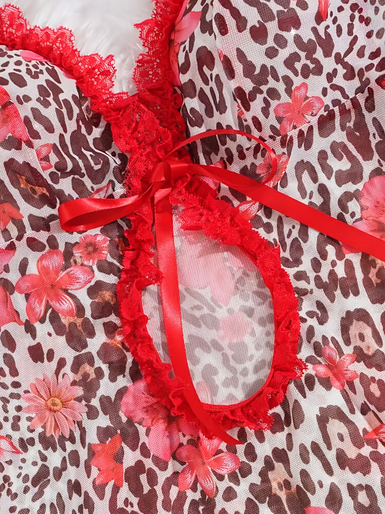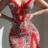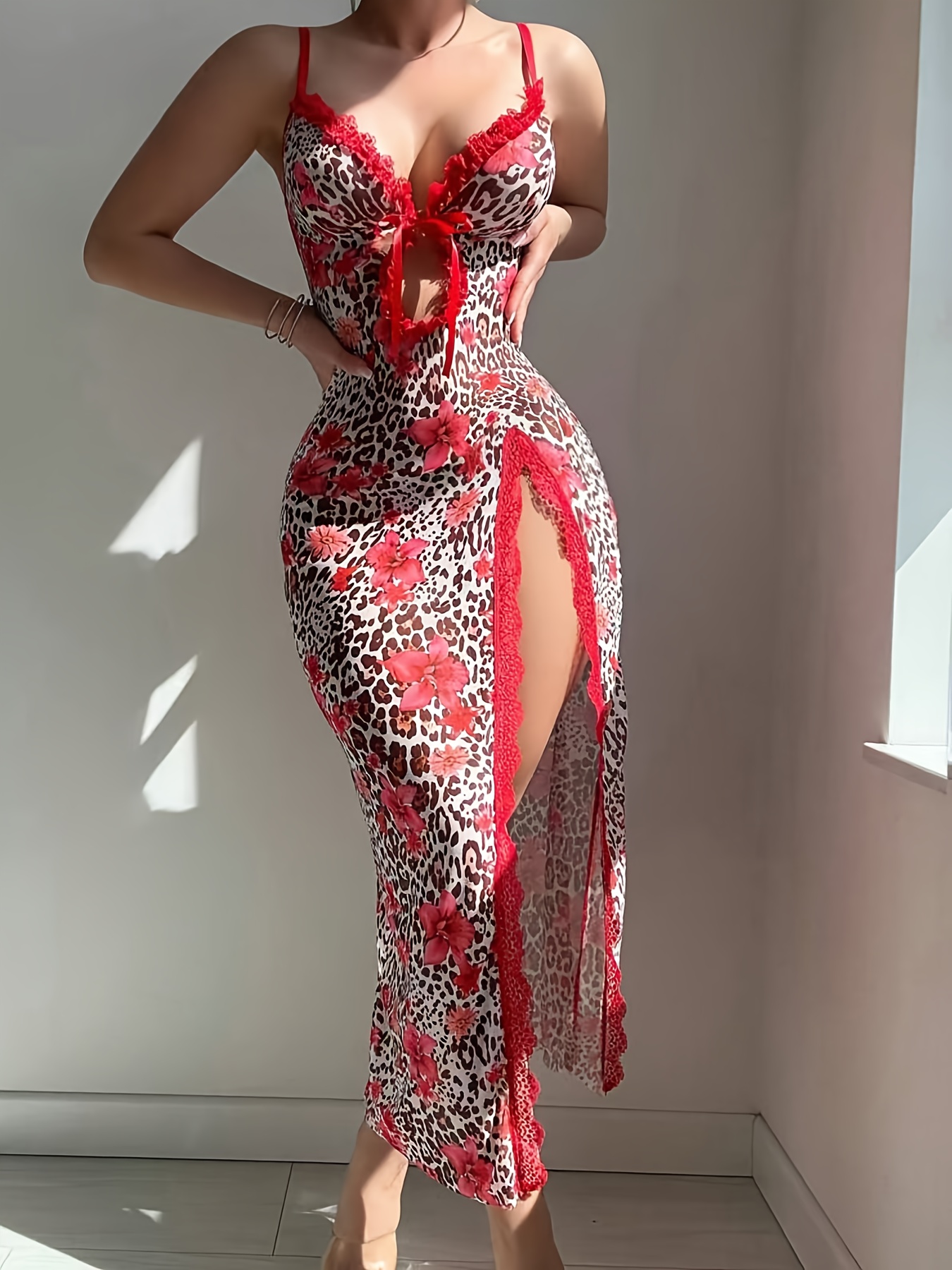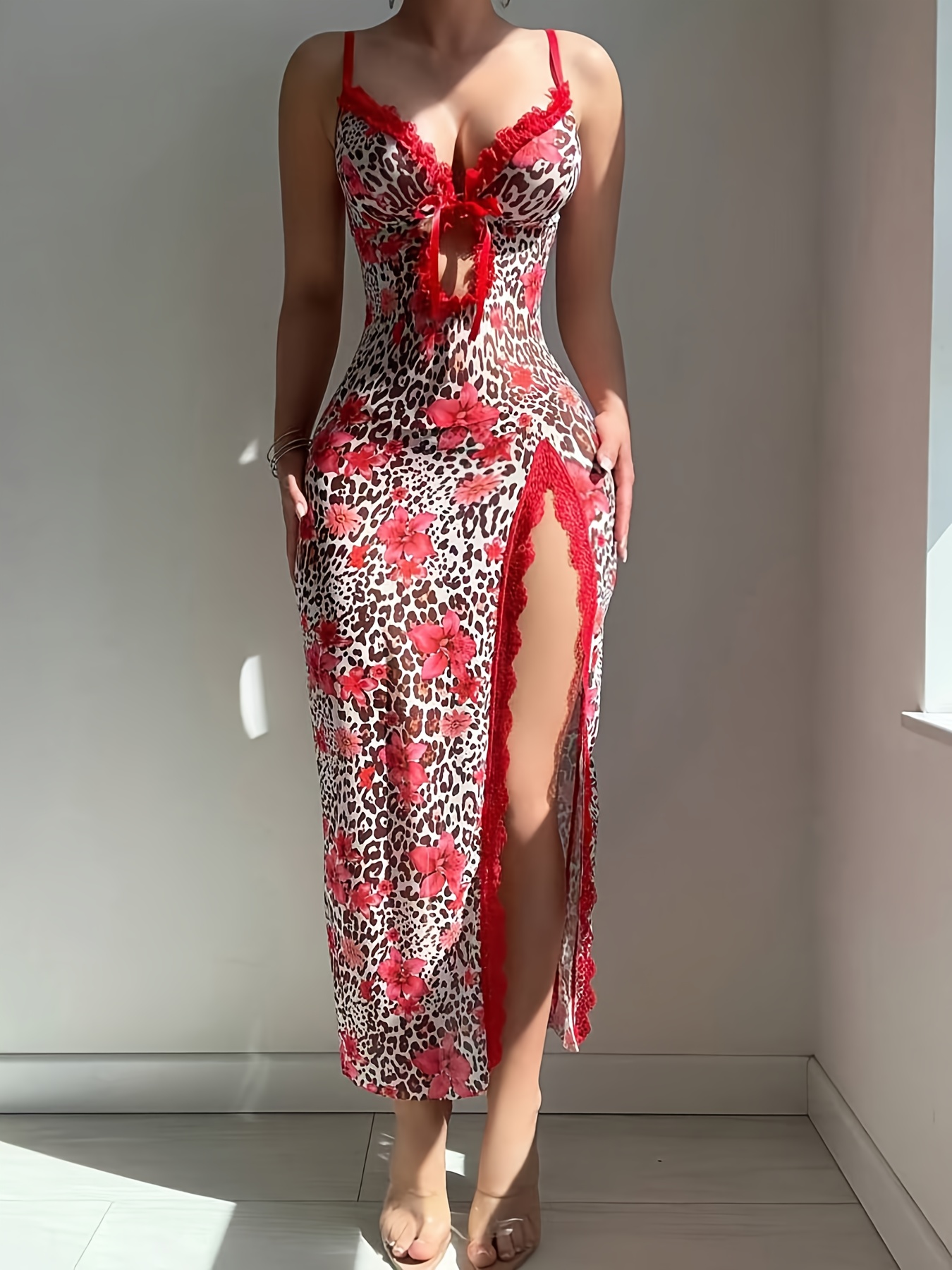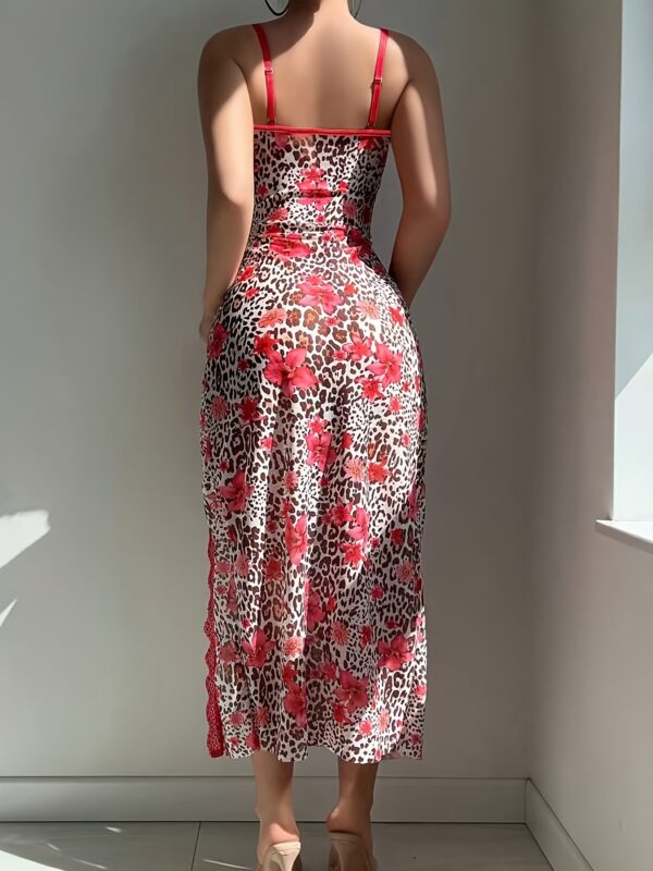 - تصميم يجمع بين الأناقة والجاذبية: يتميز الطقم بمزيج فريد من نقشة الفهد الجريئة ولمسات الورود الرقيقة، مع تفاصيل الدانتيل الشبكي المتباين وفتحة أمامية أنيقة، ليمنحكِ إطلالة ساحرة ولا تُنسى في كل مناسبة.