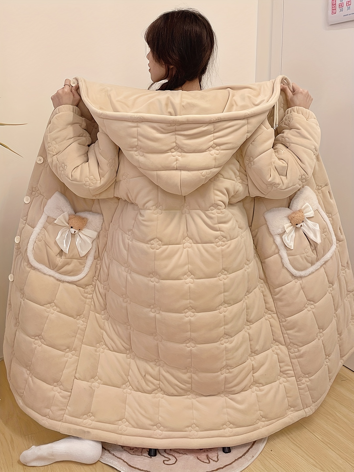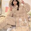- تصميم كرتوني جذاب: أضفي لمسة من البهجة والمرح على لياليكِ مع نقوش كرتونية لطيفة، بالإضافة إلى قبعة مريحة (هودي) للحفاظ على دفء رأسكِ وأذنيكِ.
