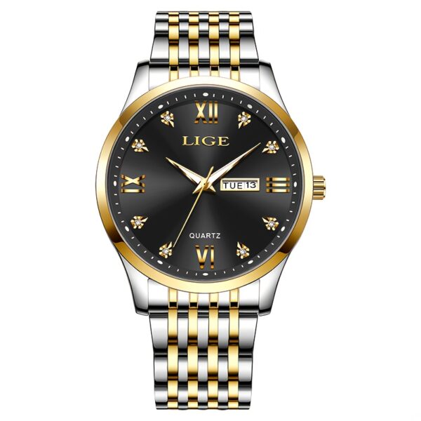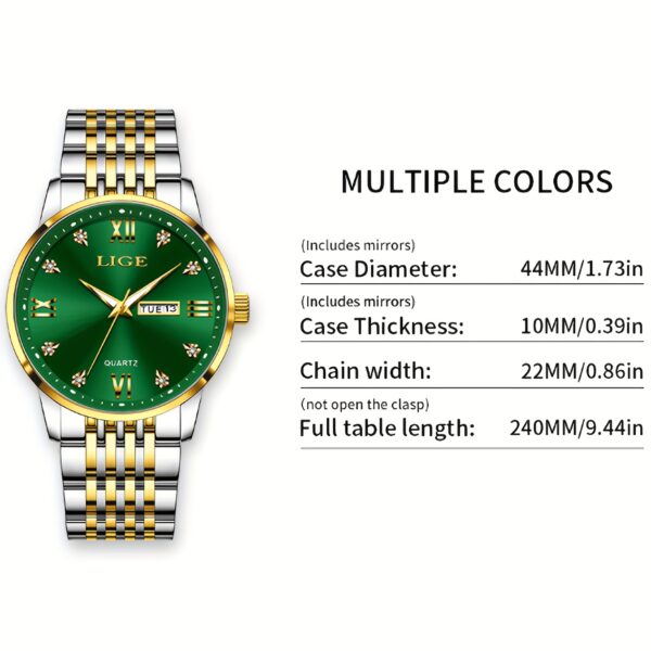 • تصميم متين وأنيق: تتميز الساعة بهيكل مصقول بدقة من سبيكة عالية الجودة وسوار أنيق من الفولاذ المقاوم للصدأ، مما يمنحها مظهرًا فاخرًا ويضمن متانة تدوم طويلاً.