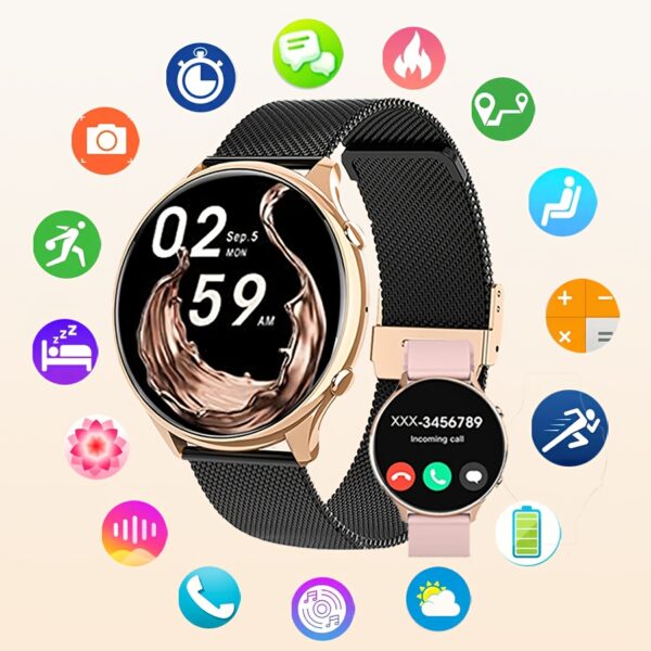 • توافق واسع: تتوافق الساعة بسلاسة مع معظم الهواتف الذكية، لتمنحك تجربة استخدام متكاملة وبلا تعقيدات.