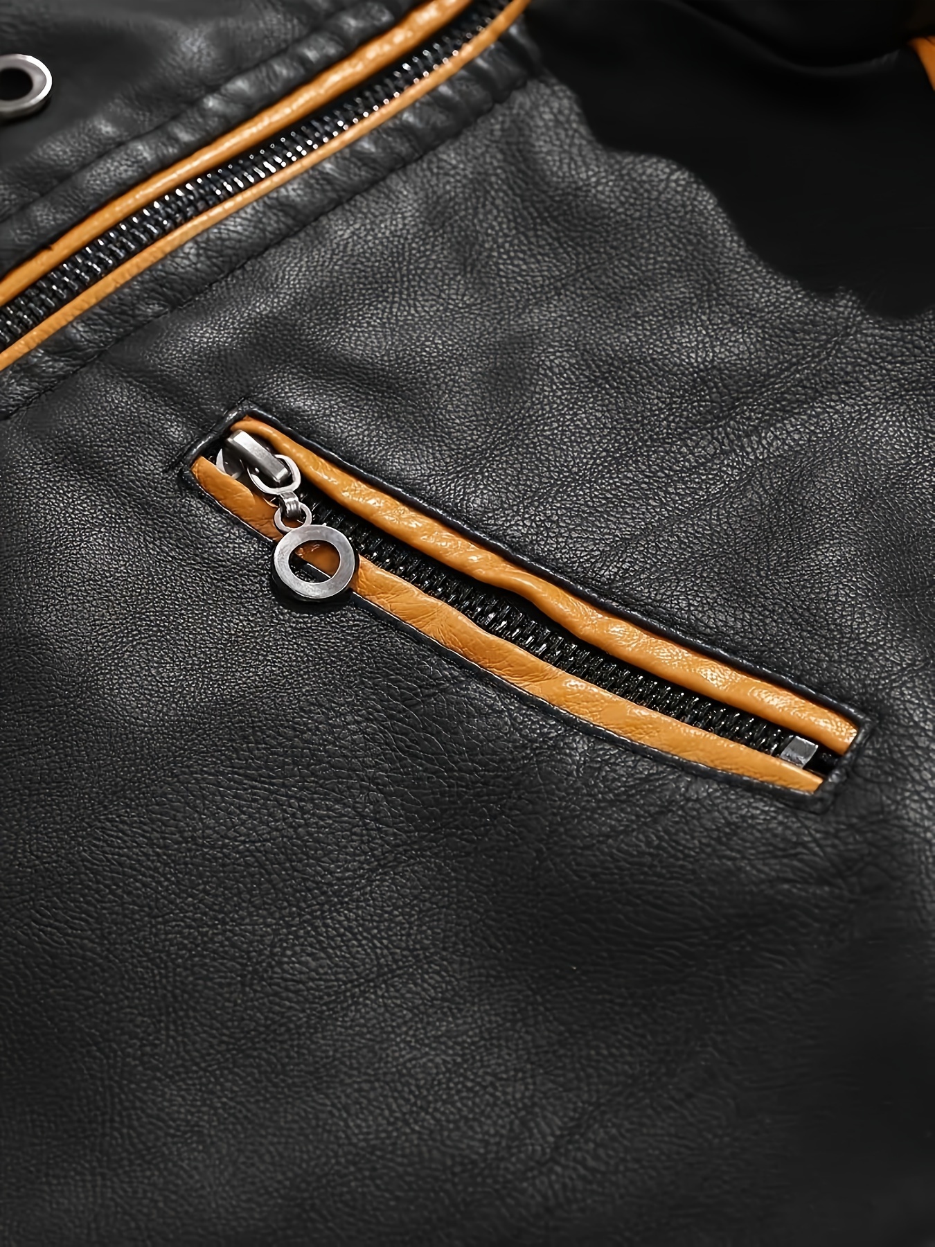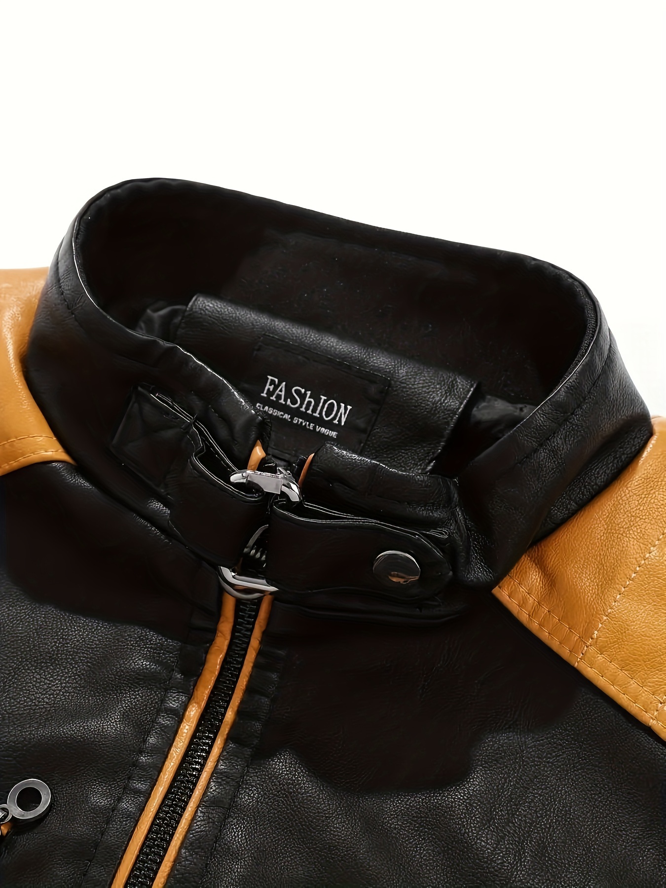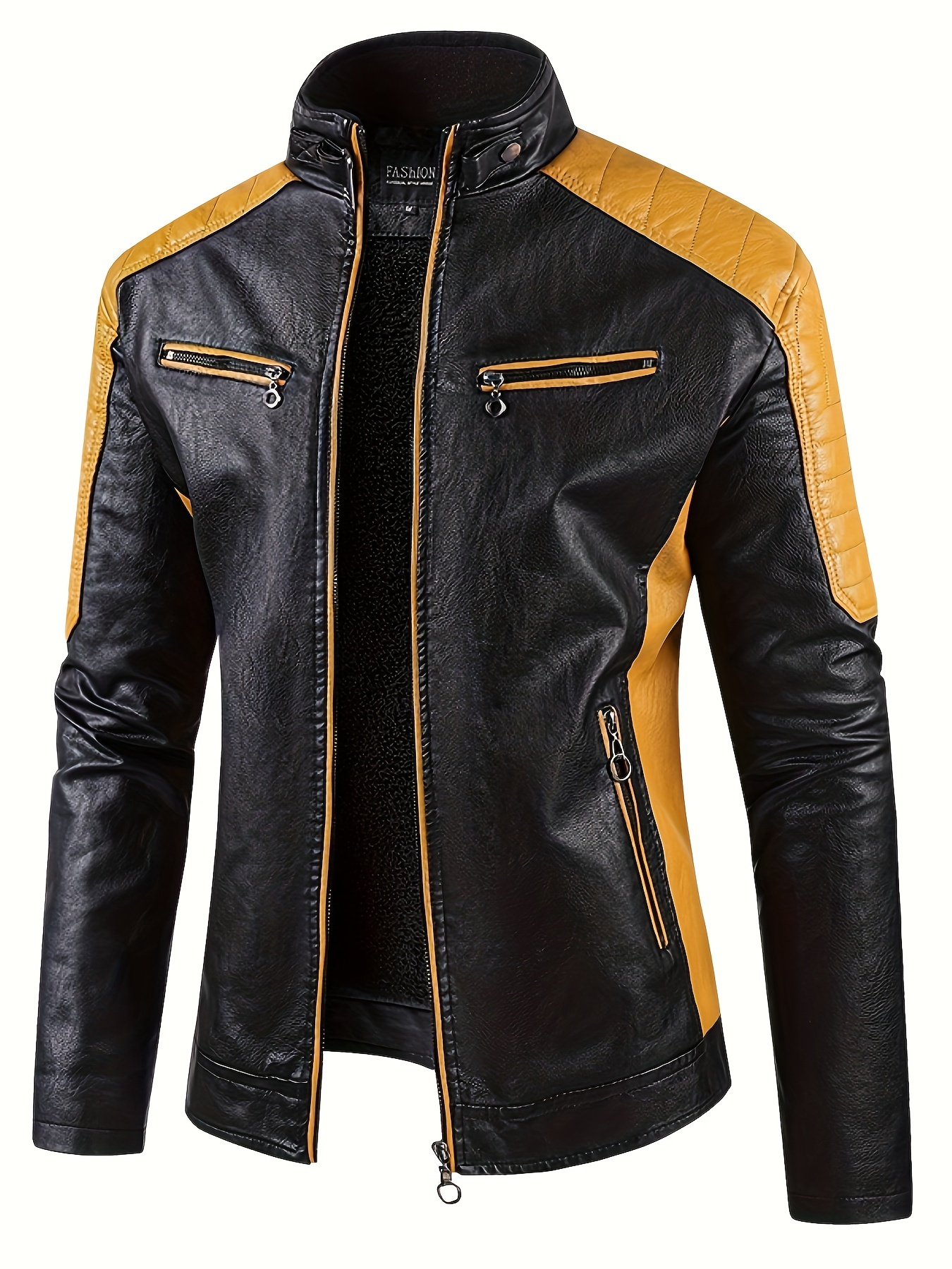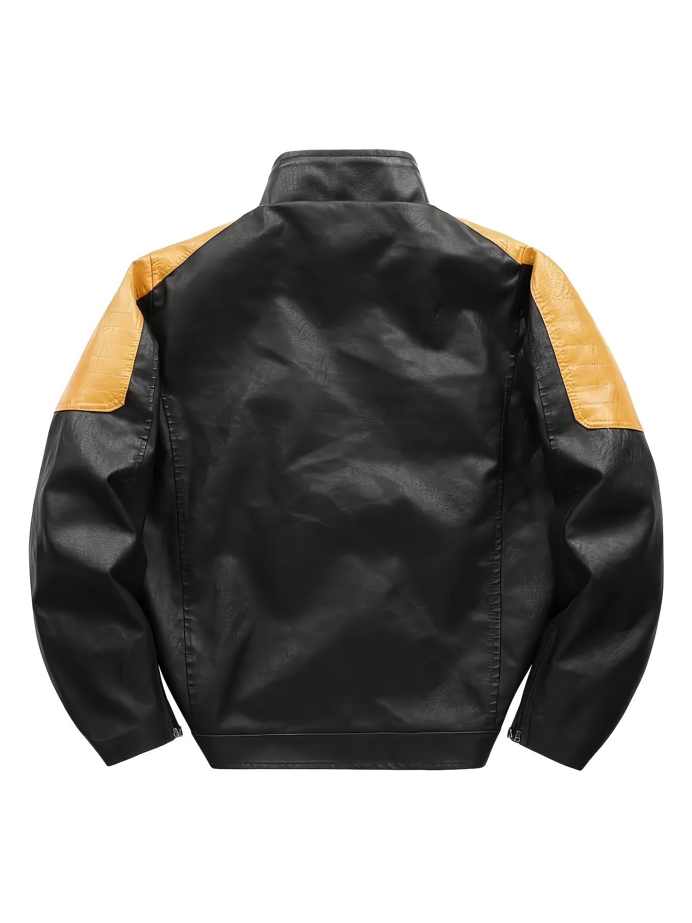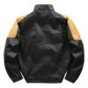 - تصميم عصري وملفت: يتميز بتصميم “Color Block” جريء باللونين الأسود والأصفر، مع ياقة قائمة أنيقة وسحاب أمامي كامل بلون ذهبي فاخر يضيف لمسة من الرقي والتميز. مزود بجيوب عملية لتخزين أغراضك الأساسية بأمان وسهولة، مع تفاصيل دقيقة تعزز من جاذبيته.