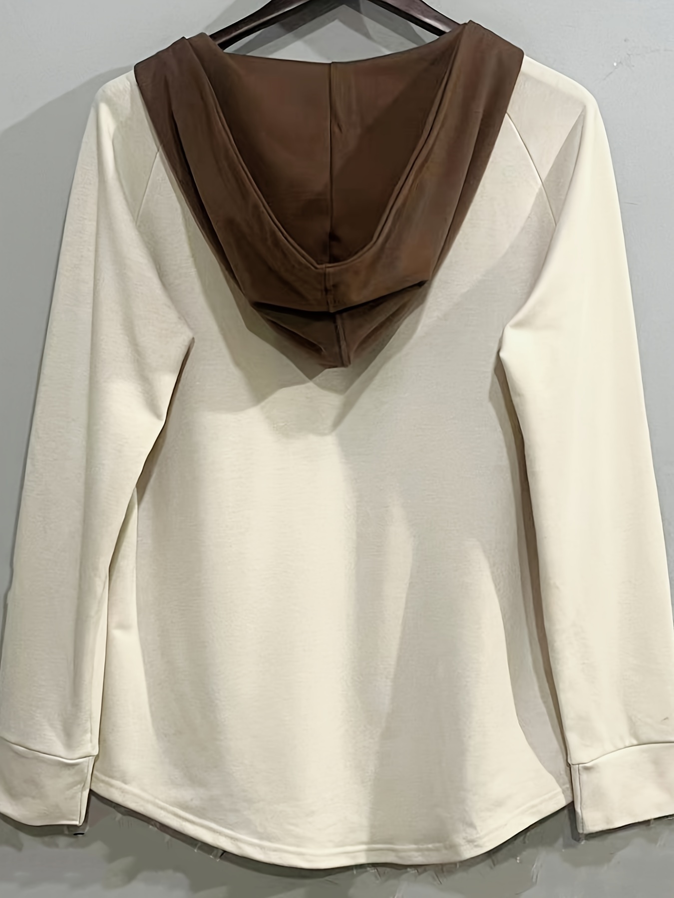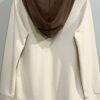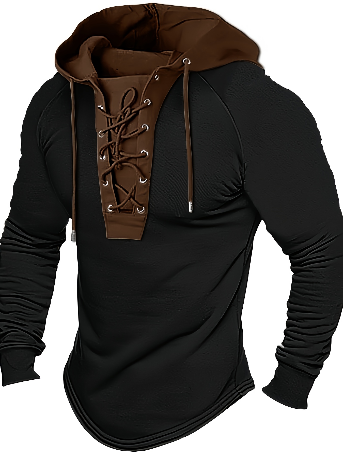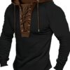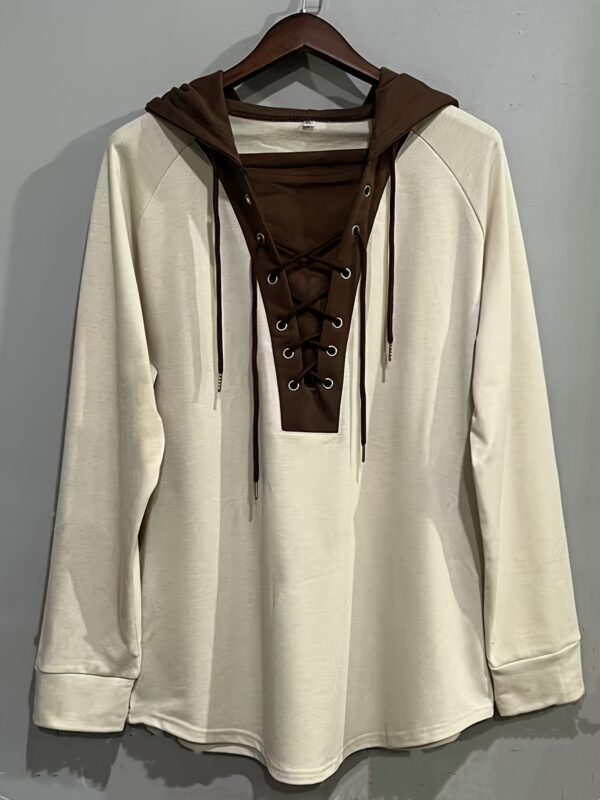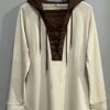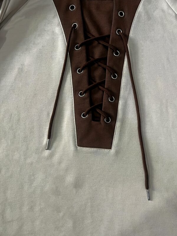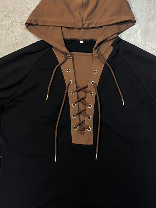 - تفاصيل فريدة تبرز أناقتك: يتميز هذا الهودي بتصميم قبعة مميز بلونين (بيج وبني) يضفي لمسة عصرية وجذابة. كما أن تفاصيل الأربطة (Lace-up) تضفي عليه طابعًا فريدًا يجعلك محط الأنظار.