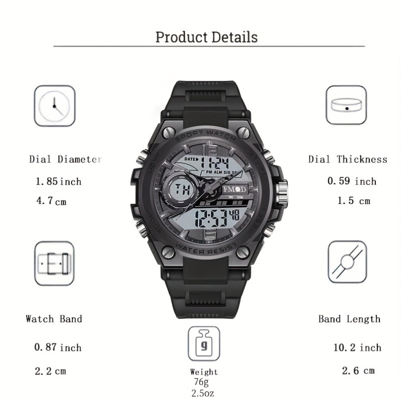 - شاشة رقمية واضحة وكبيرة: استمتع برؤية فائقة للوقت والبيانات بفضل الشاشة الكبيرة والمضيئة بتقنية LED، مما يضمن قراءة سهلة في جميع الظروف الليلية والنهارية.