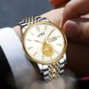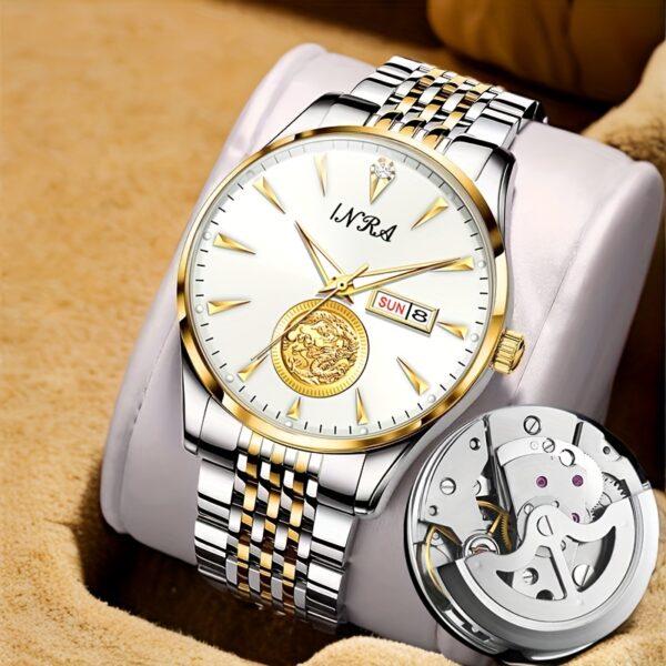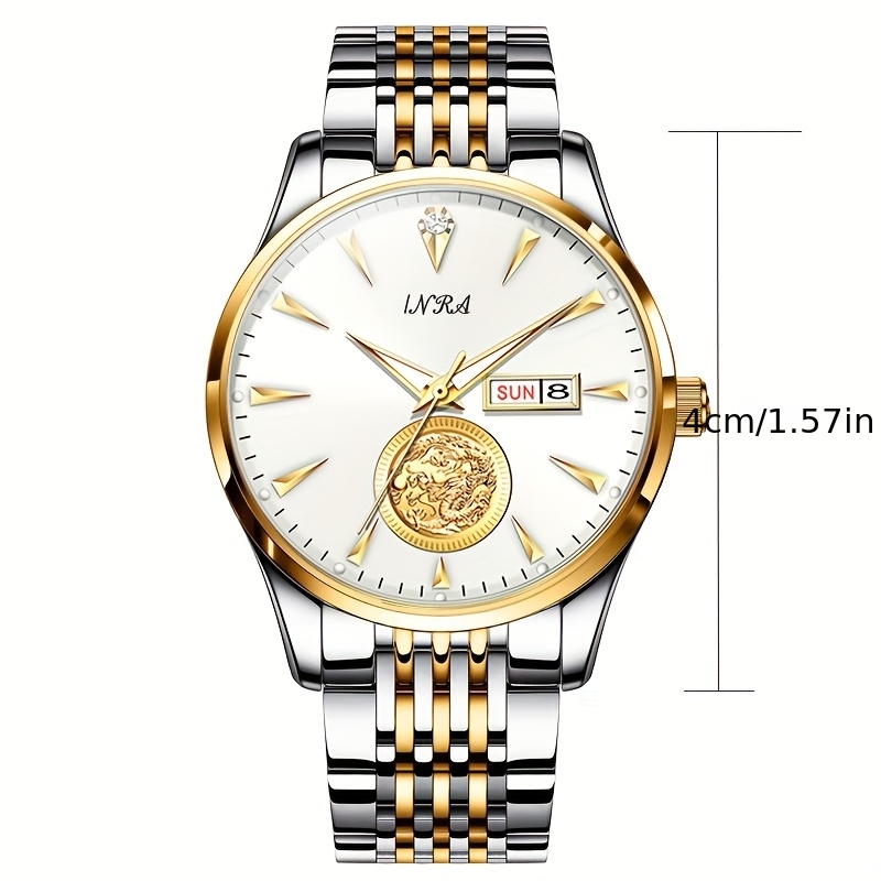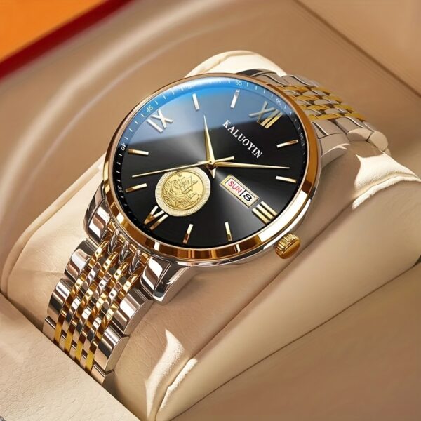 • تصميم ملكي: مينا ذهبي فاخر يبرز جمال الساعة ويزيدها فخامة، مع عقارب دقيقة تضفي لمسة من الأناقة الكلاسيكية التي لا تفقد بريقها.