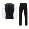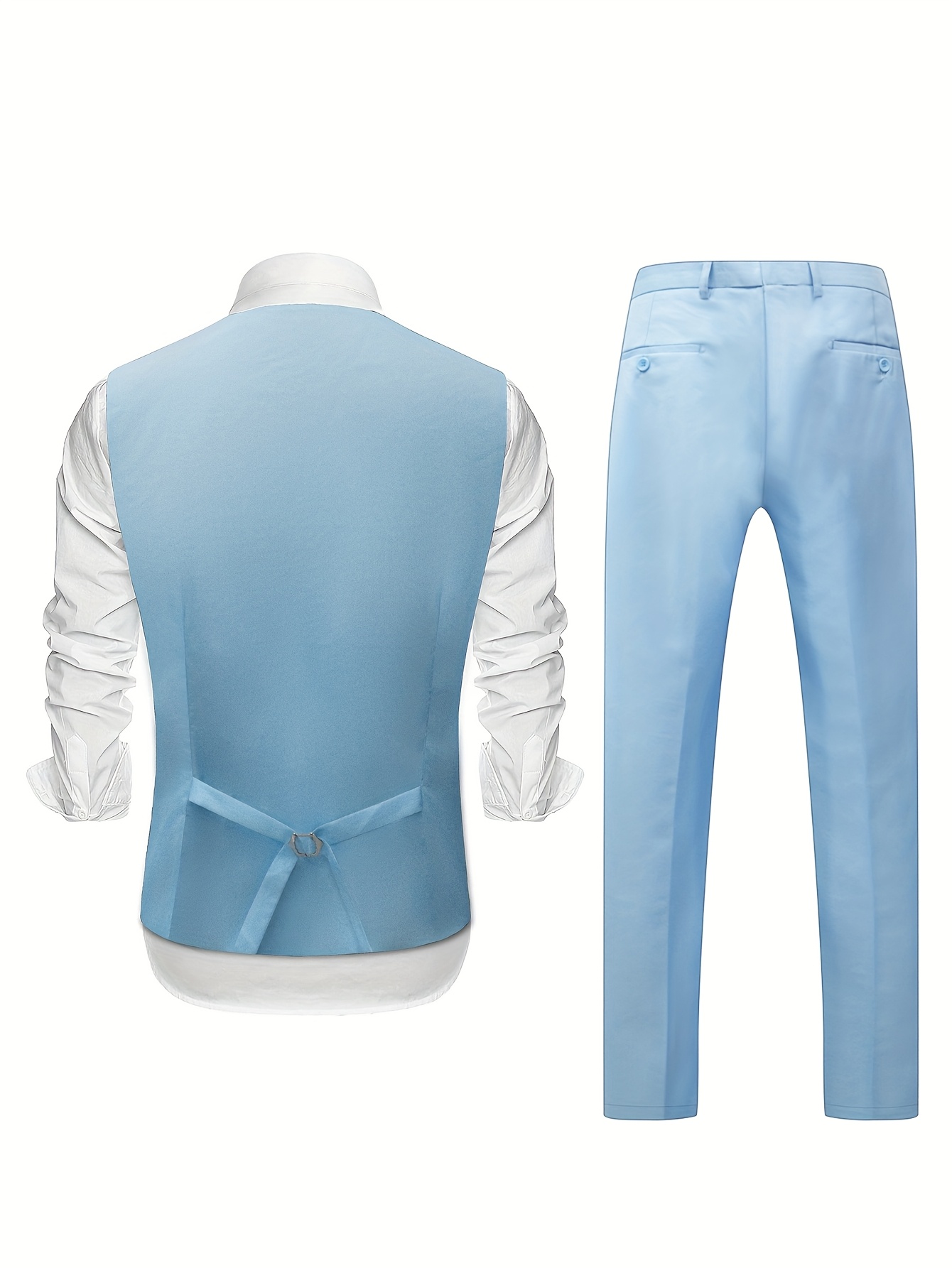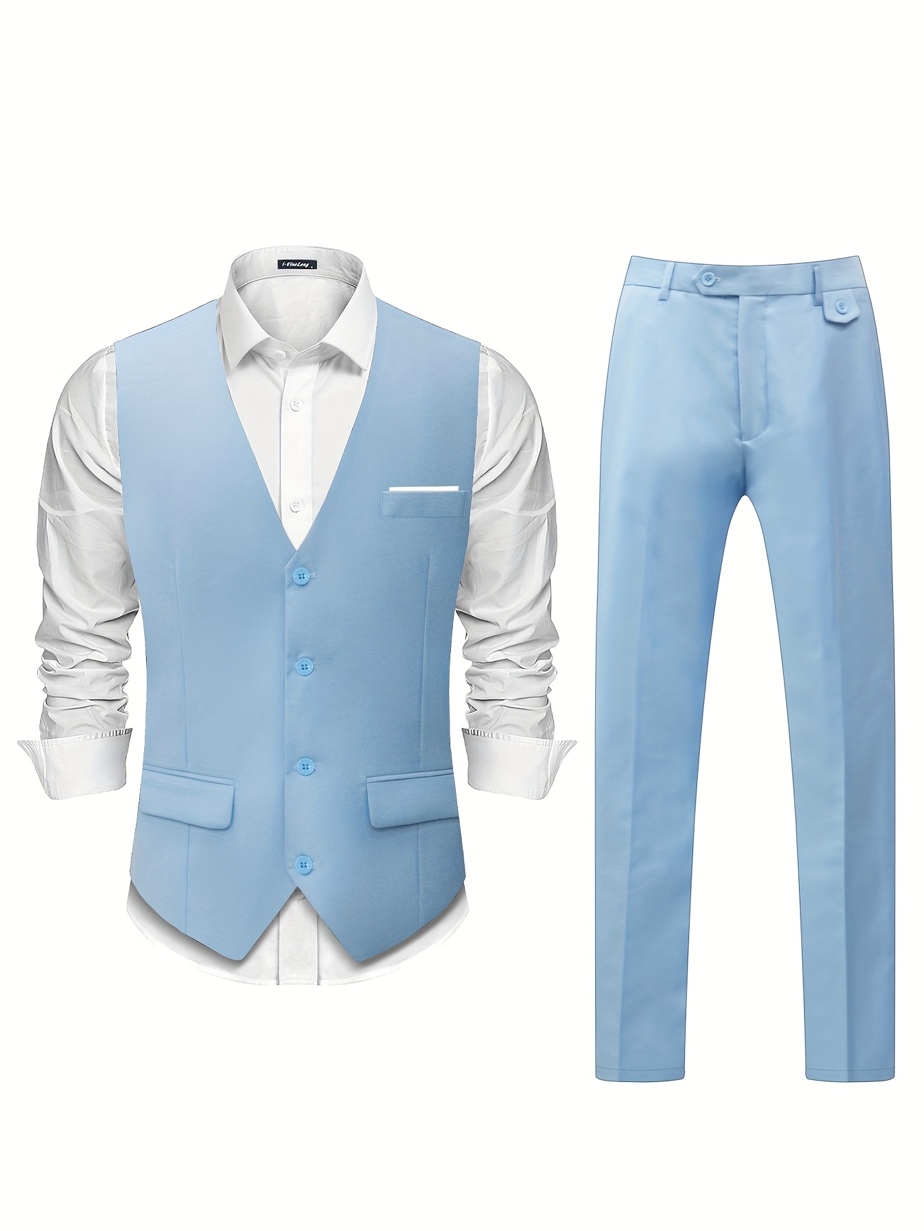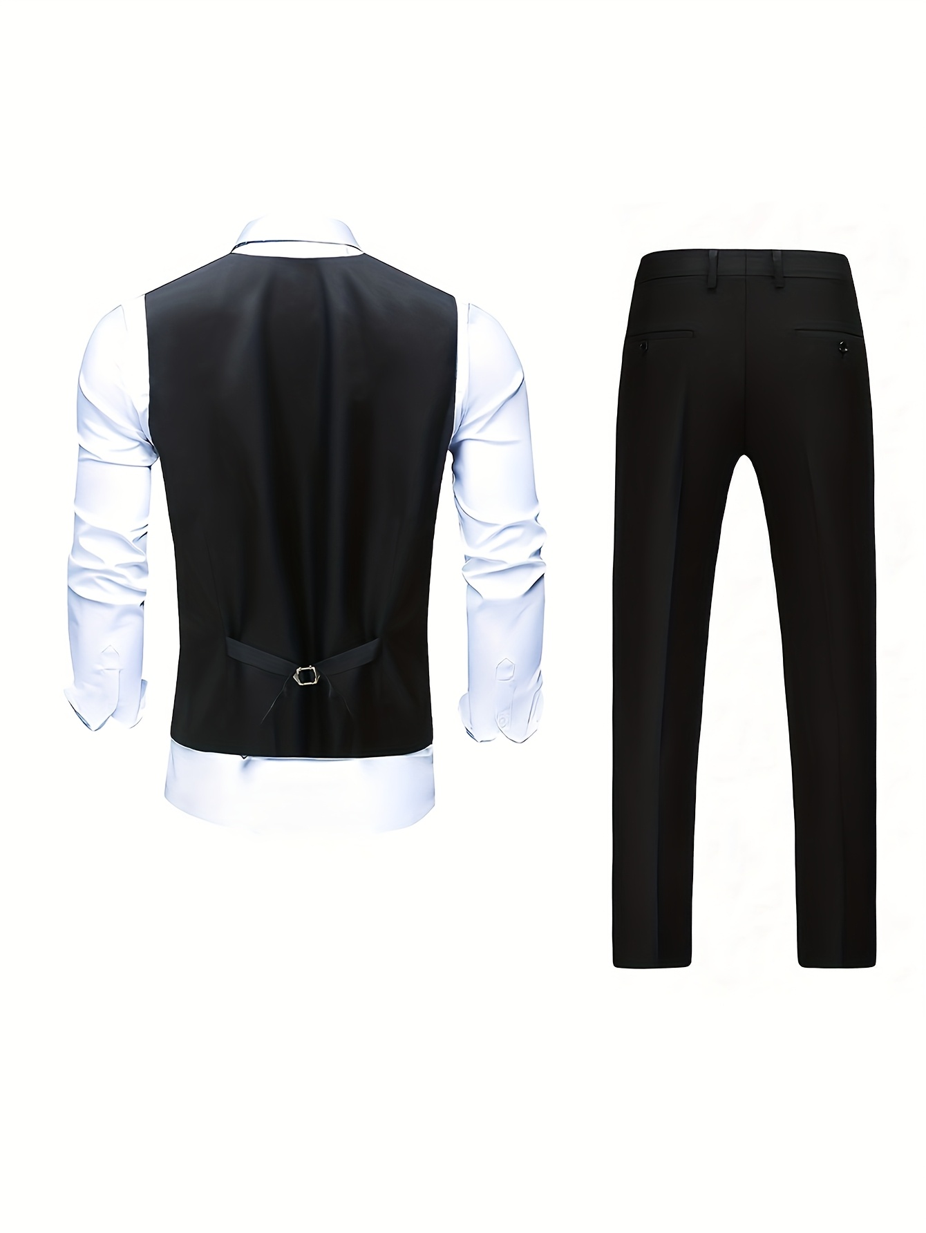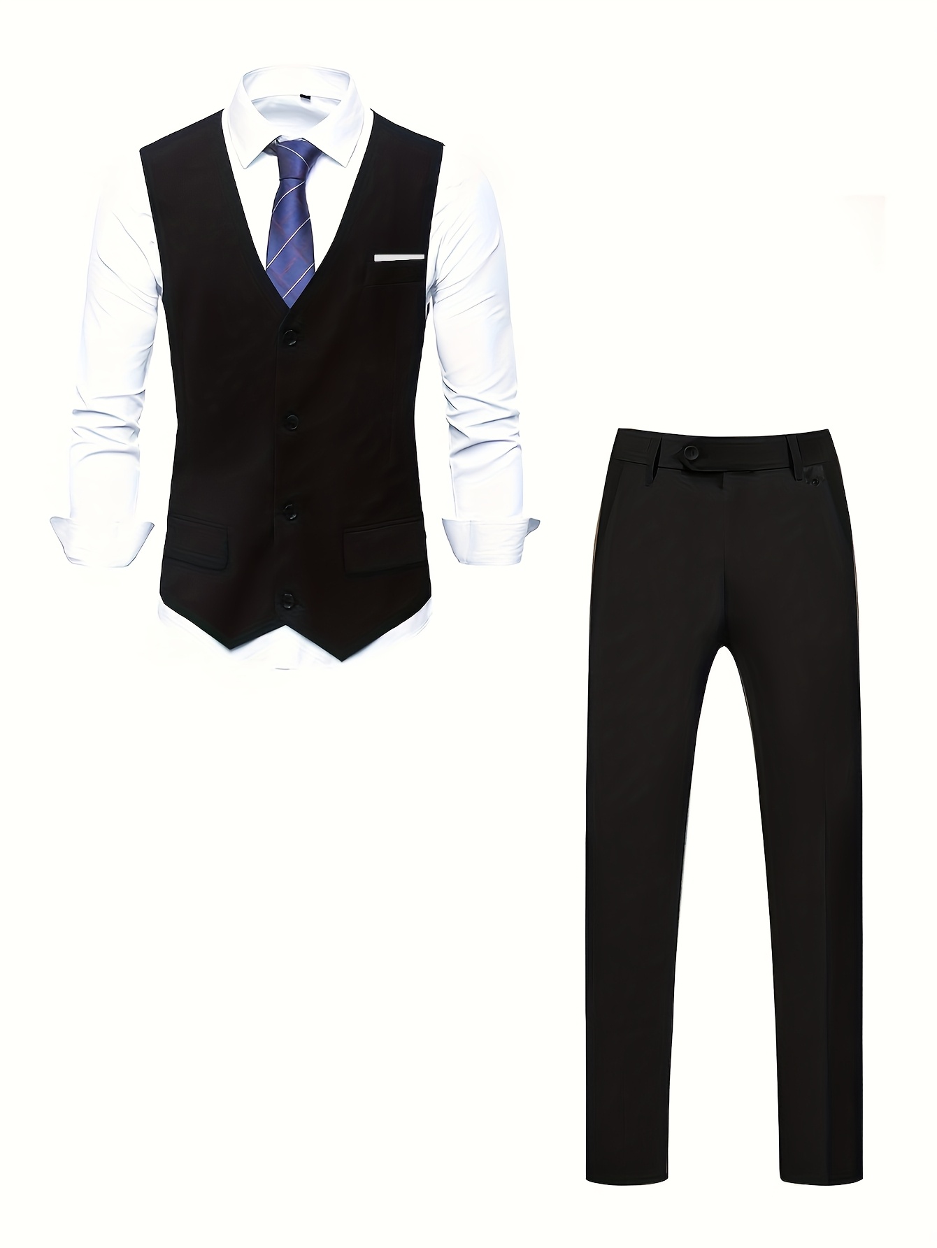- تصميم متكامل وعصري (قطعتين): يتكون الطقم من سترة (فيست) أنيقة وبنطال بقصة عصرية، مما يمنحك خيارات متعددة لتنسيق إطلالاتك، سواء بارتداء القطعتين معًا أو بشكل منفصل.