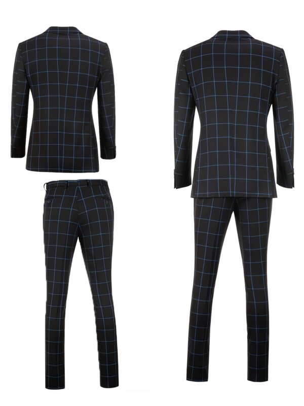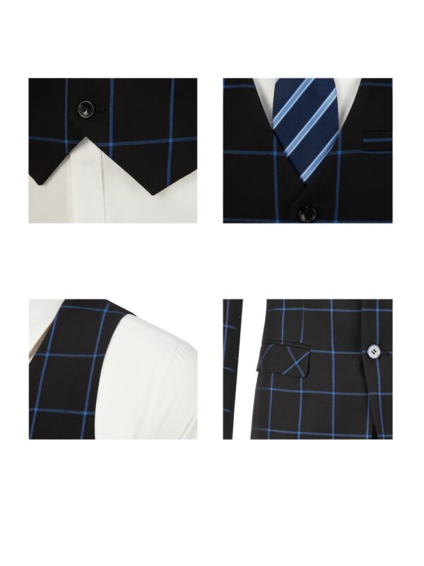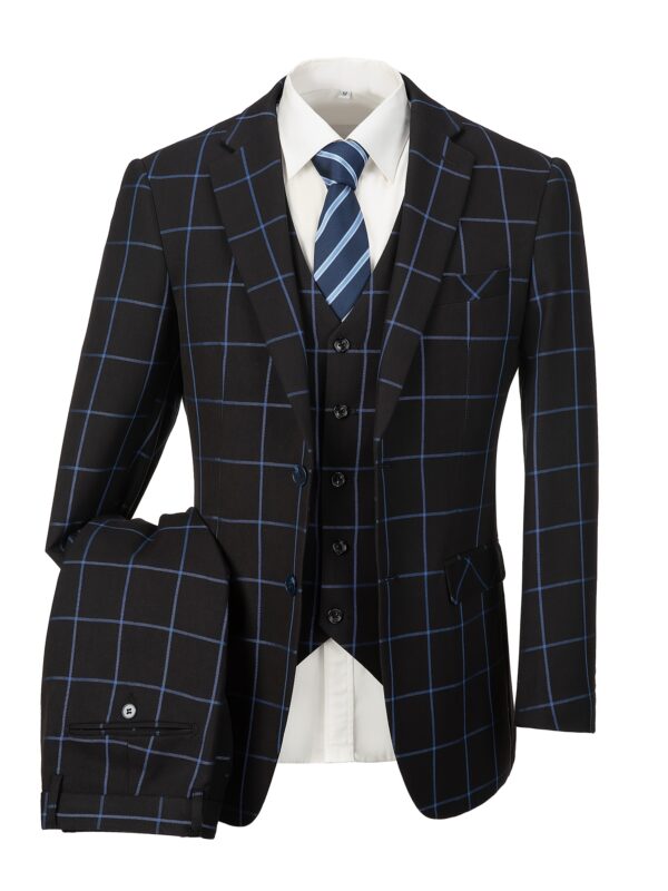 - طقم ثلاثي متكامل: يتكون الطقم من جاكيت أنيق بزرين مزدوجين، صدرية (فيست) عملية، وبنطال بقصة مثالية، ليمنحك إطلالة متناسقة وجذابة بسهولة.