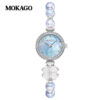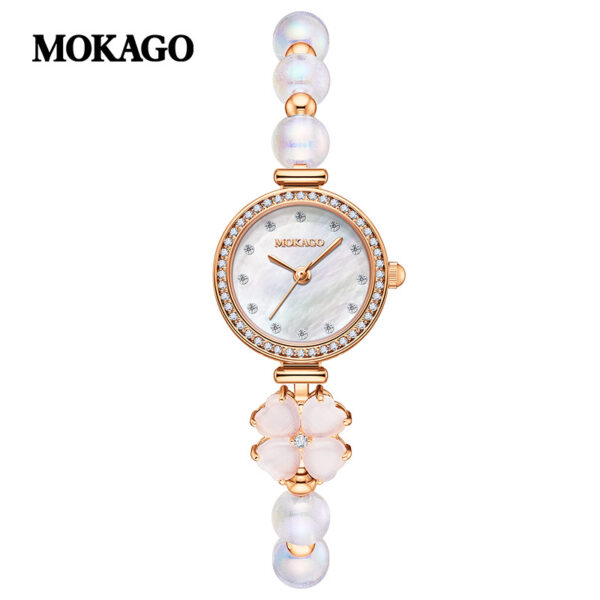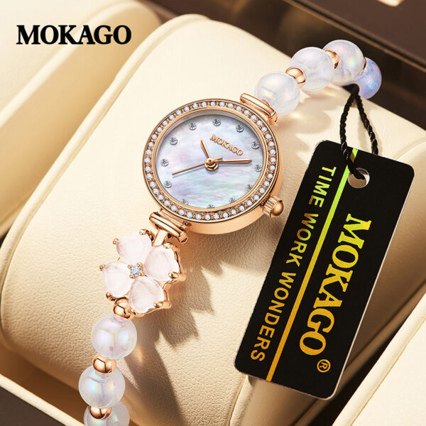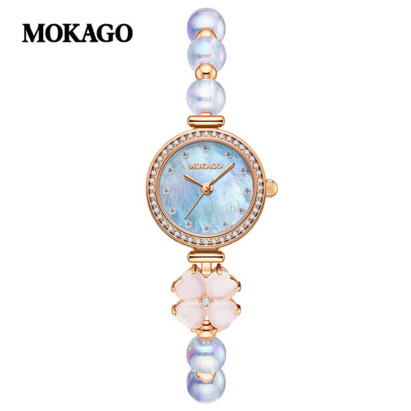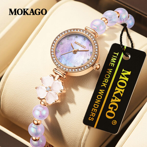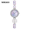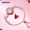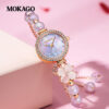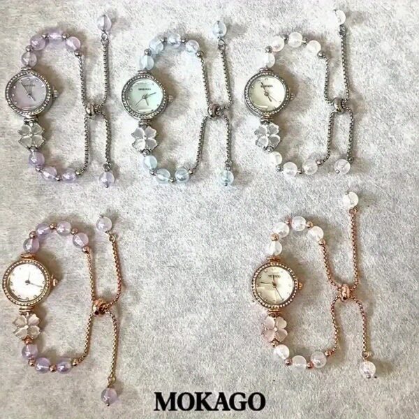 - تصميم ساحر ومبتكر: تتميز بميناء فريد بألوان قوس قزح زاهية تسر الناظر، وسوار أنيق بلون ذهبي وردي خلاب، مرصع بلمسات من الأحجار الكريمة الصناعية التي تضفي بريقًا لا يقاوم على معصمك.