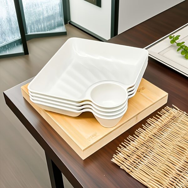 • تصميم مقسم ذكي: يتميز كل طبق بأقسام مستطيلة تساعدك على فصل الأطعمة المختلفة وتقديمها بطريقة أنيقة ومنظمة، مما يضيف لمسة احترافية لمائدتك ويحافظ على نكهات الأطعمة منفصلة.