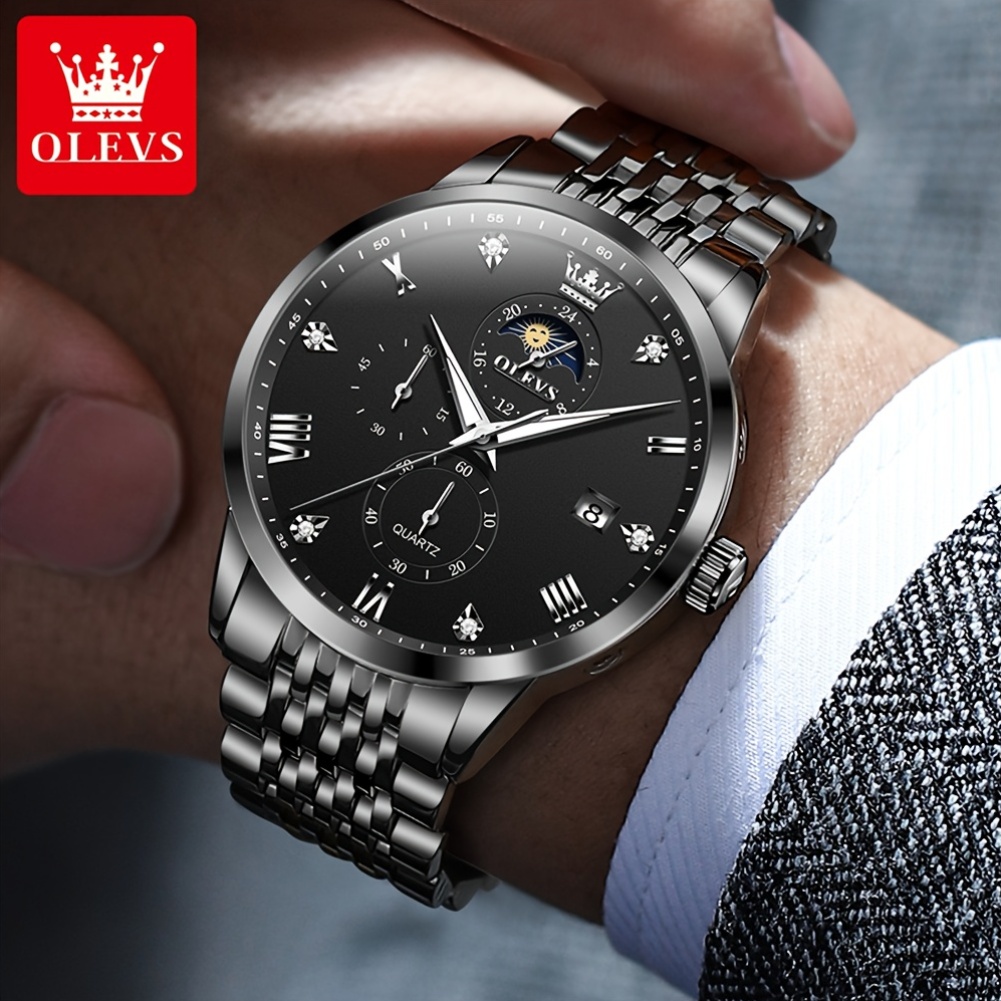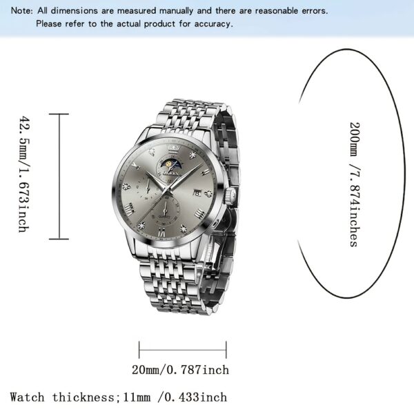- وظائف متعددة: لا تكتفِ بعرض الوقت فقط! تتضمن الساعة عرض التاريخ، وظيفة الكرونوغراف (ساعة الإيقاف) الدقيقة، وميزة مؤشر مراحل القمر الجذابة، لتجمع بين الأناقة والعملية.