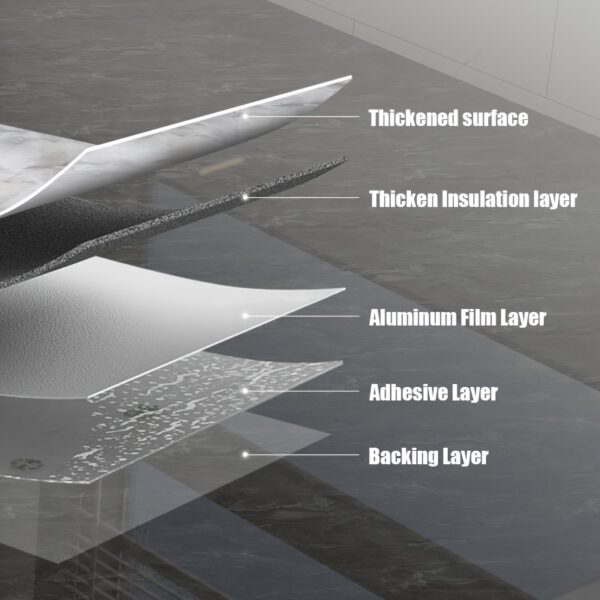 - سمك مثالي ومتانة عالية: بسماكة 3 ملم، يوفر هذا اللاصق إحساساً فاخراً وجودة عالية، معززاً مقاومته للتآكل اليومي ويمنحه مظهراً واقعياً كأرضيات الرخام الحقيقية.