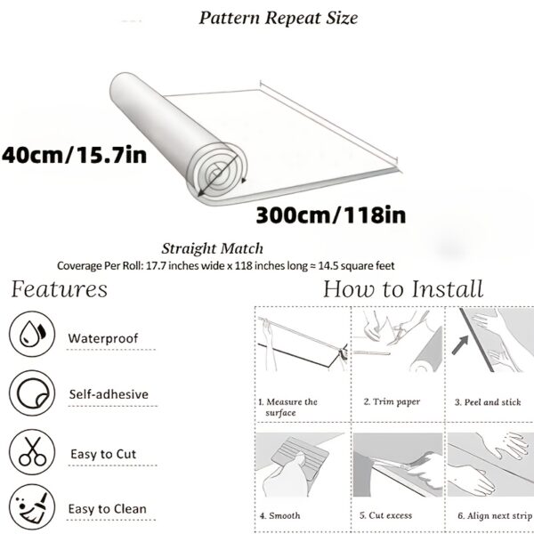 - مقاس كبير لتغطية واسعة: لفة واحدة سخية بأبعاد 39.88 سم × 299.97 سم (حوالي 0.4 متر × 3 أمتار) توفر تغطية مثالية لمساحات واسعة، مما يقلل من الوصلات ويجعل عملية التثبيت أسرع وأكثر سلاسة.