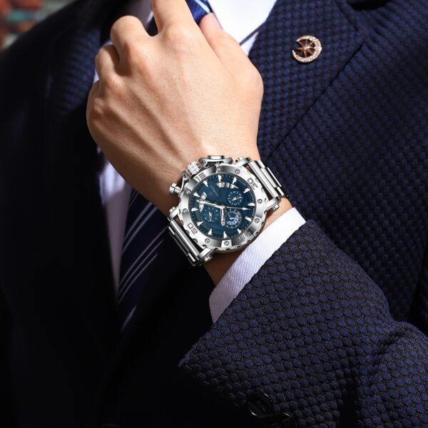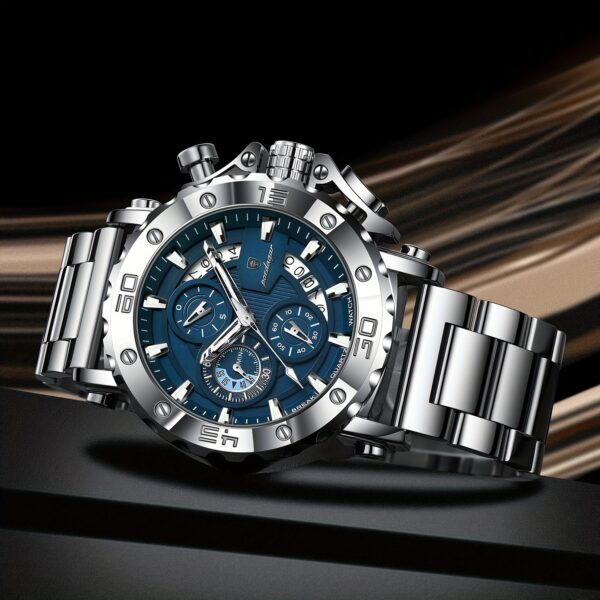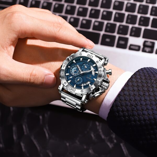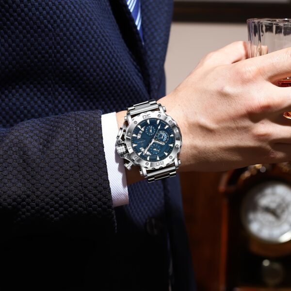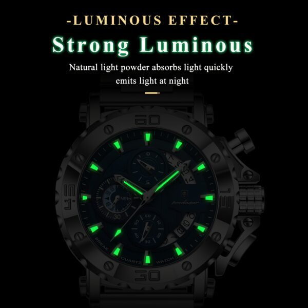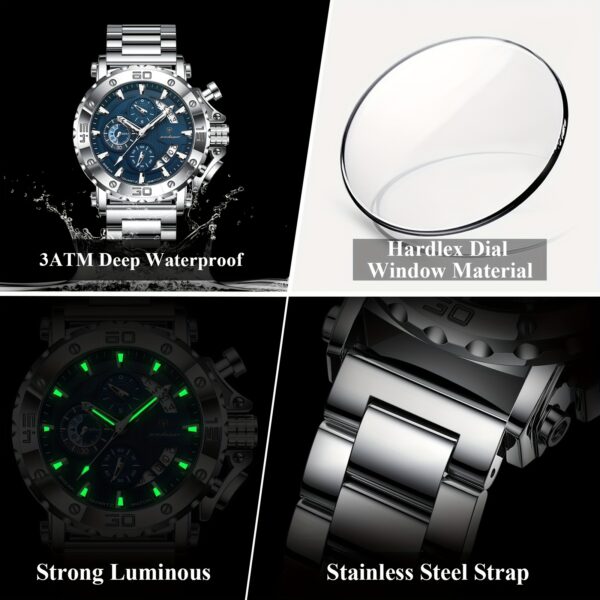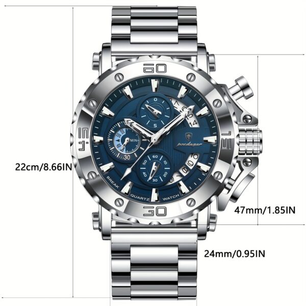 - مينا متعدد الوظائف: يتميز بمينا أزرق أنيق وجذاب ومضيء في الظلام، مع مؤشرات واضحة للتاريخ واليوم وعرض 24 ساعة، لتبقى مطلعًا على كل تفاصيل الوقت بلمحة واحدة.