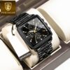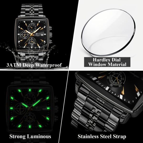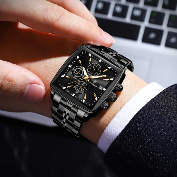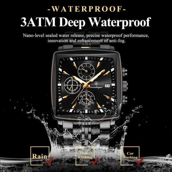 - تصميم فاخر للميناء: ميناء أسود أنيق بشكل مربع، يتميز بلمسات ذهبية راقية وعقارب مصقولة، يمنحها جاذبية لا تقاوم ومظهرًا ملكيًا يلفت الأنظار.