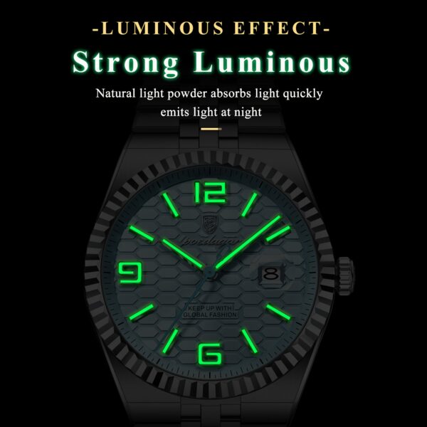 - عقارب مضيئة: تتيح لك قراءة الوقت بوضوح تام حتى في الأماكن قليلة الإضاءة، لتجمع بين العملية والأناقة.