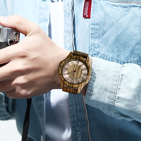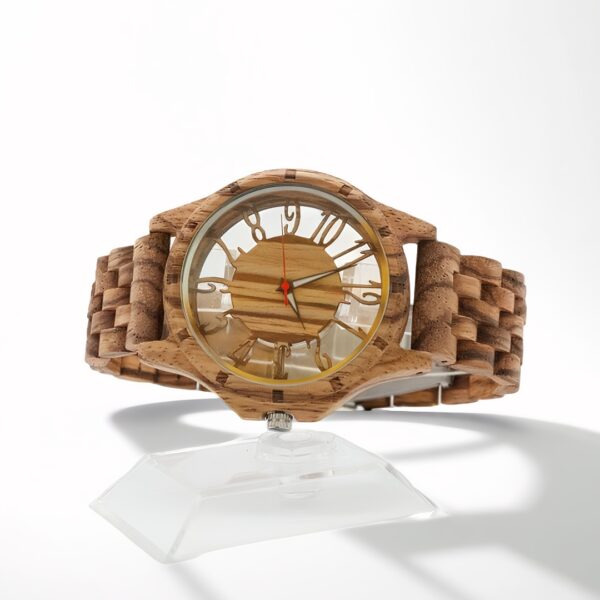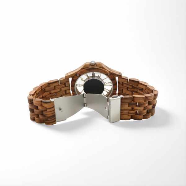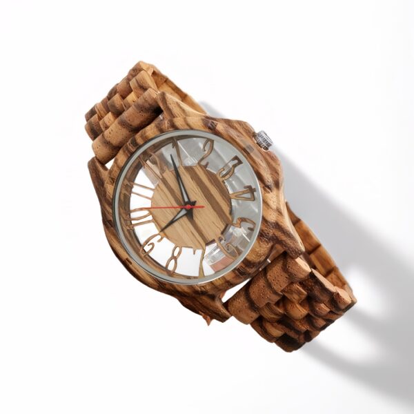 - خشب الزيبرا الطبيعي الأصيل: مصنوعة يدوياً بالكامل من خشب الزيبرا الفاخر، مع علبة وسوار يتميزان بأنماط حبيبات خشبية فريدة لكل ساعة، مما يضمن لك قطعة فنية لا تتكرر. تمنحك إحساساً بالدفء والأصالة لا مثيل له.