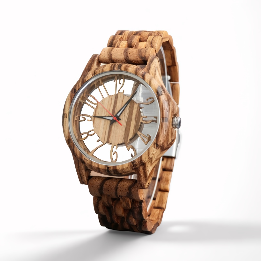- خشب الزيبرا الطبيعي الأصيل: مصنوعة يدوياً بالكامل من خشب الزيبرا الفاخر، مع علبة وسوار يتميزان بأنماط حبيبات خشبية فريدة لكل ساعة، مما يضمن لك قطعة فنية لا تتكرر. تمنحك إحساساً بالدفء والأصالة لا مثيل له.